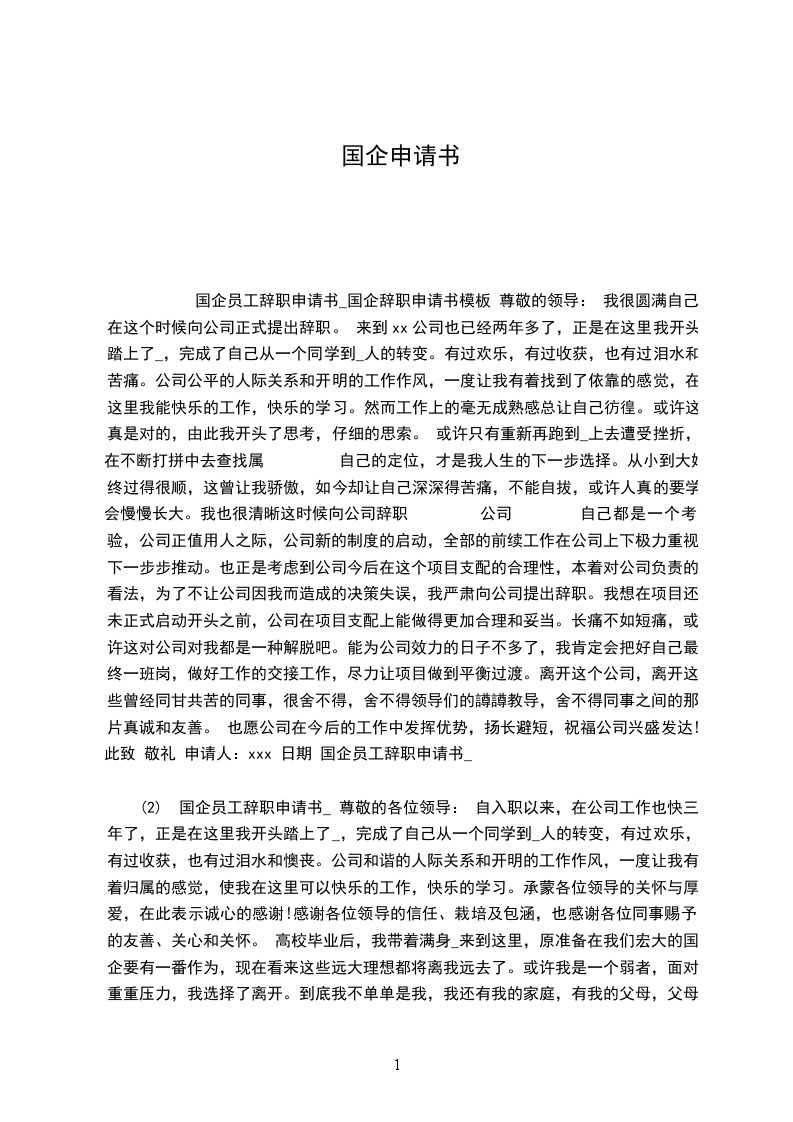 (2) 国企员工辞职申请书_ 尊敬的各位领导: 自入职以来,在公司工作也快三年了,正是在这里我开头踏上了_,完成了自己从一个同学到_人的转变,有过欢乐,有过收获,也有过泪水和懊丧。公司和谐的人际关系和开明的工作作风,一度让我有着归属的感觉,使我在这里可以快乐的工作,快乐的学习。承蒙各位领导的关怀与厚爱,在此表示诚心的感谢!感谢各位领导的信任、栽培及包涵,也感谢各位同事赐予的友善、关心和关怀。 高校毕业后,我带着满身_来到这里,原准备在我们宏大的国企要有一番作为,现在看来这些远大理想都将离我远去了。或许我是一个弱者,面对重重压力,我选择了离开。到底我不单单是我,我还有我的家庭,有我的父母,父母的哺育之恩是我一辈子要回报的,现在父母身体健康状况欠佳,需要有人照看,我不能太过 自私,不能为了自己的事业而忽视了他们的感受。全部这一切让我不得不重新考虑自己的人生,一切的抱负和理想都是过眼云烟,在这繁忙的都市我终将面临选择,虽然这会让我留下终生的圆满,但是我想做一个好儿子比什么都重要,况且干那一行都能为国家作贡献,我绝不会辜负党对我多年来的培育。 这段时间,我会把自己负责的工作完成好,假如我的离去给公司带来了好多不便,我表示万分的歉意,盼望公司领导考虑我的实际状况赐予理解。我真诚的恳请公司领导批准我的辞职申请,在这里我表示诚心的感谢,同时祝福公司不断壮大进展! 盼望公司对我的申请予以考虑并批准为盼。感谢! 申请人:xx x年x月x日 国企辞职申请书模板