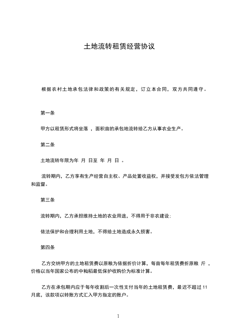 土地流转费以现金支付。自________年____月____日始至________年____月____日止的________年内,每亩每年租金为______元。此后每年的租金按______斤小麦计算,按当年____月____日前后十天的市场均价计算,但基础价格不得低于______元。