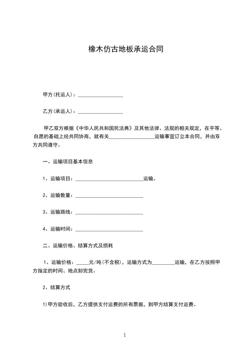 运输费用、结算方式:本次运输运费______元,本合同签订后托运人预付定金________元,货物到达卸货并由收货人确认货物完好无损后_____日内支付剩余的费用。