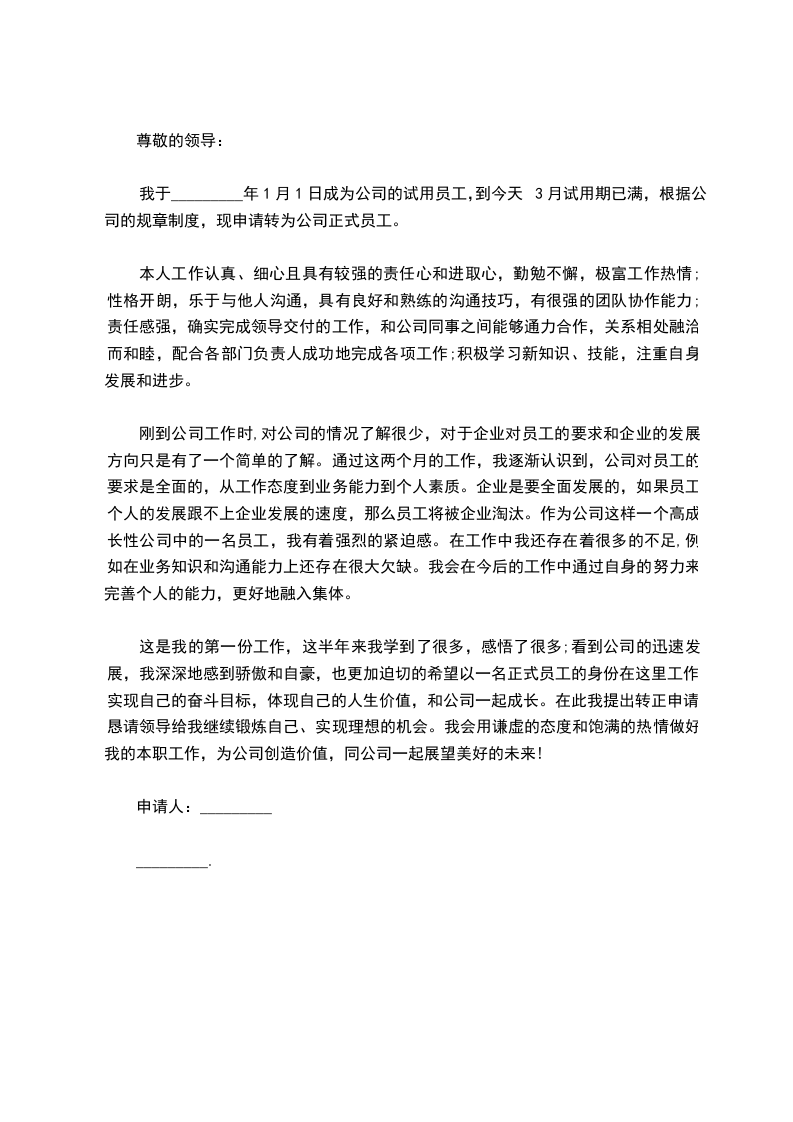 我于_________年1月1日成为公司的试用员工,到今天3月试用期已满,根据公司的规章制度,现申请转为公司正式员工。