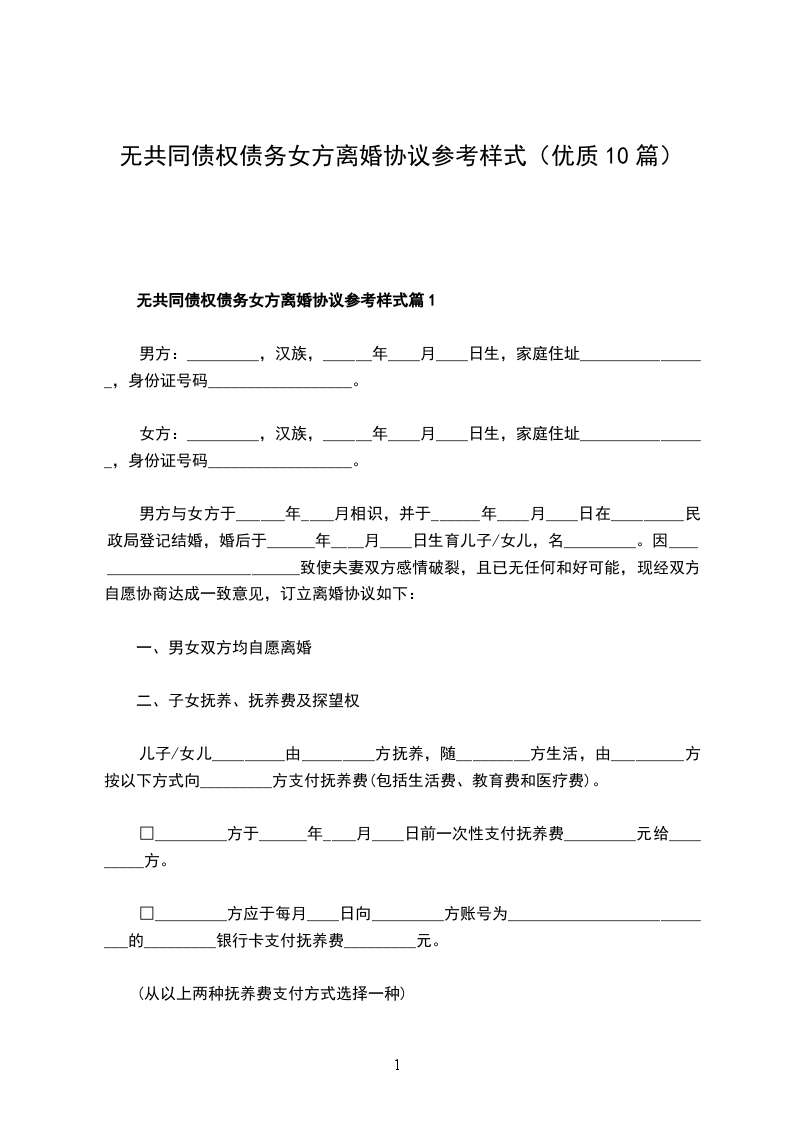 无共同债权债务女方离婚协议参考样式篇10