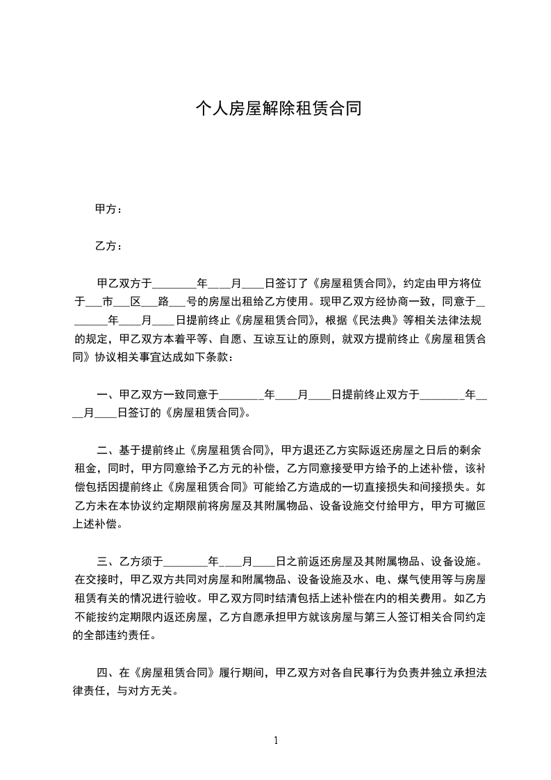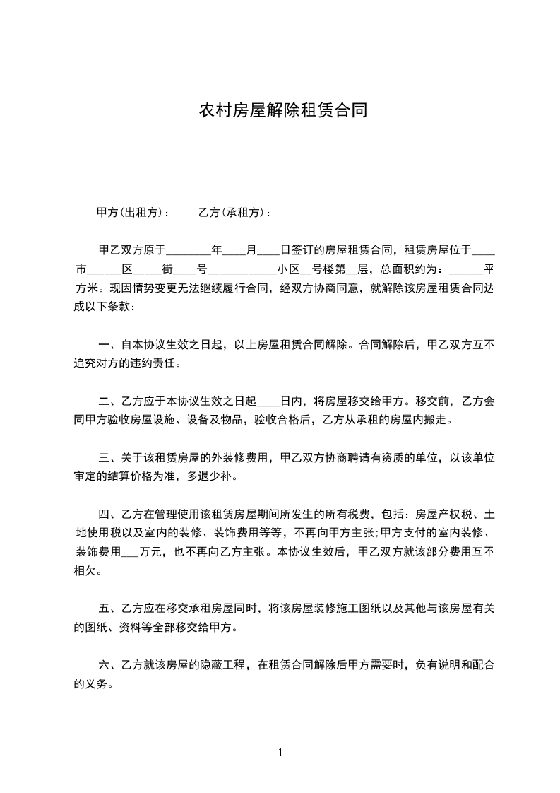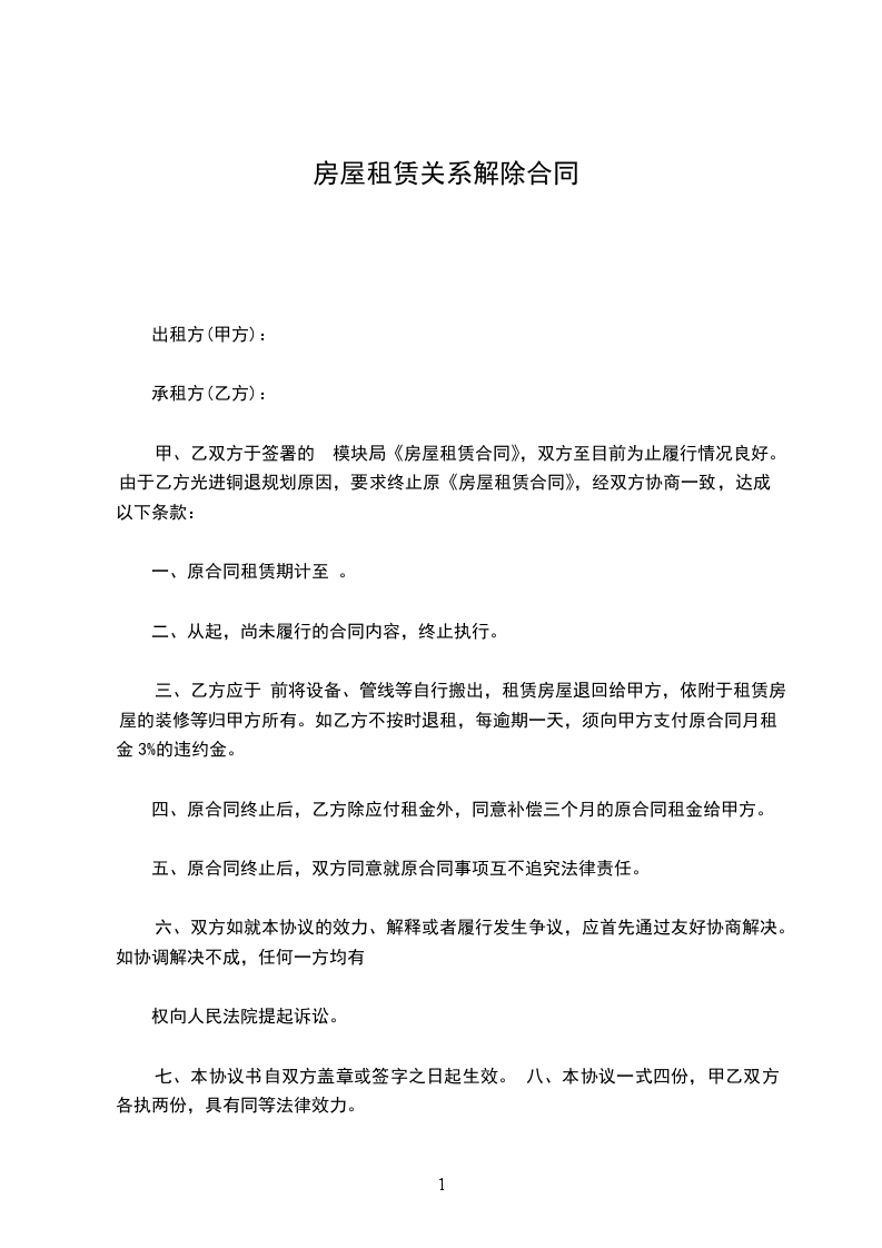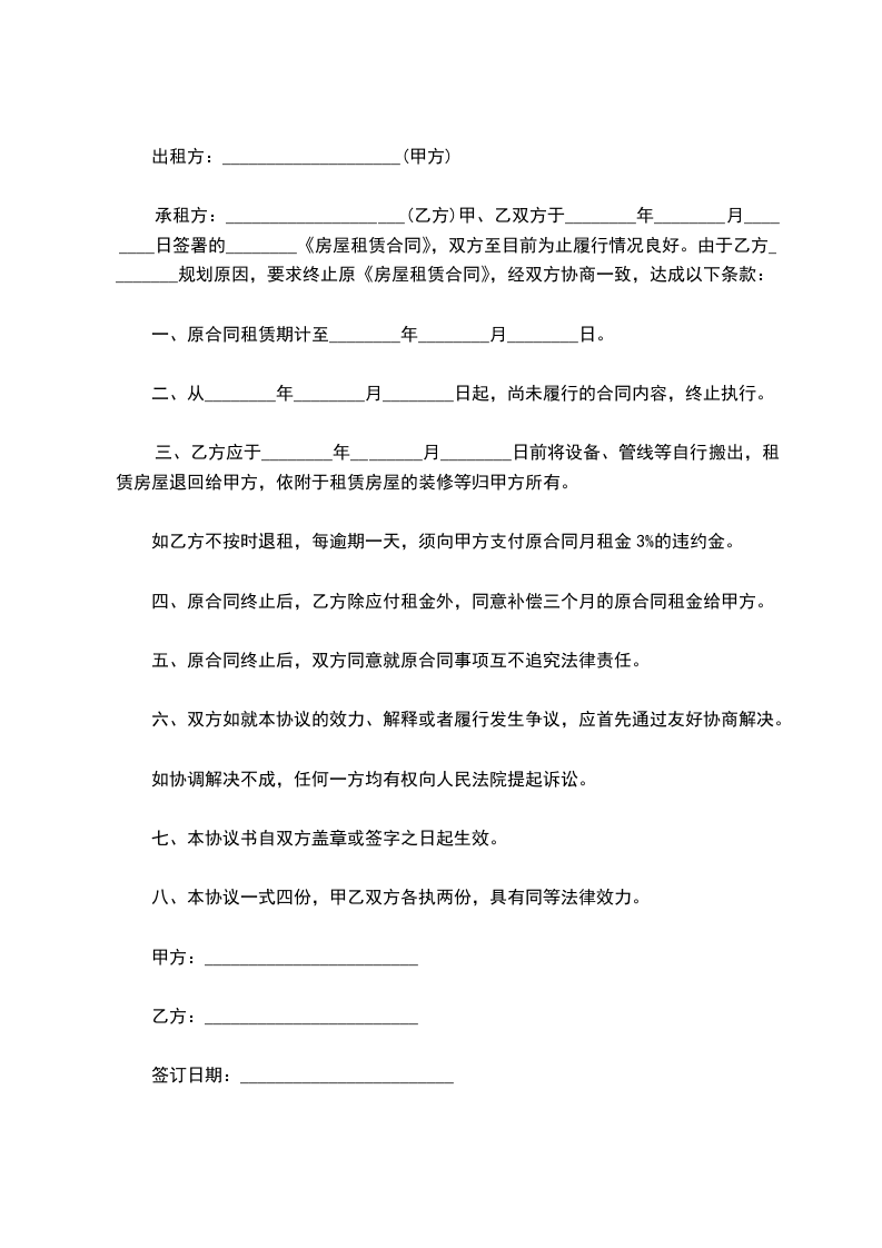 甲、乙双方于________年____月____日签署的____《房屋租赁合同》,双方至目前为止履行情况良好。由于乙方____________________规划原因,要求终止原《房屋租赁合同》,经双方协商一致,达成以下条款: