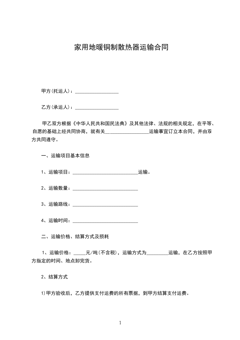 家用地暖铜制散热器运输合同
