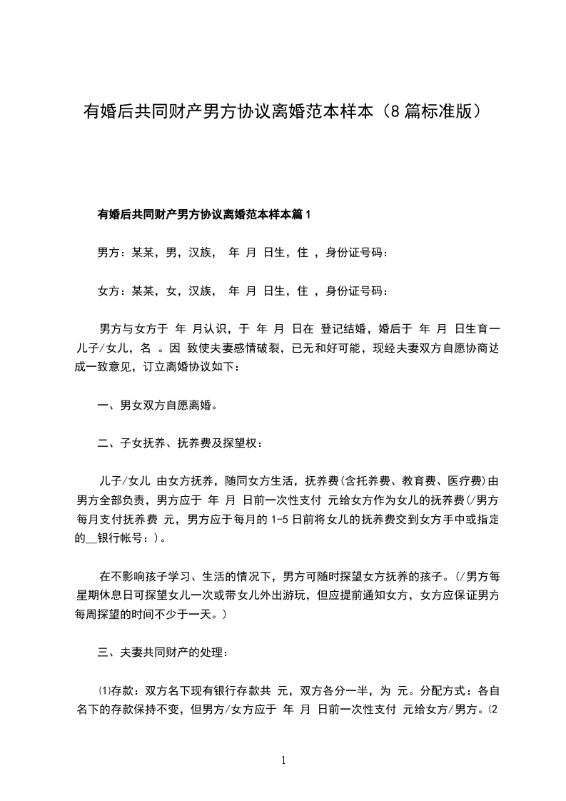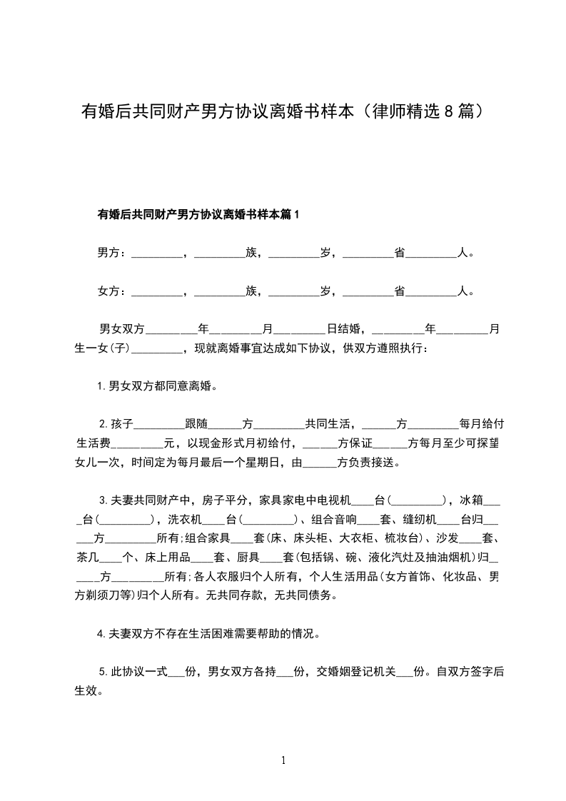 有婚后共同财产男方离婚协议参考格式篇8
