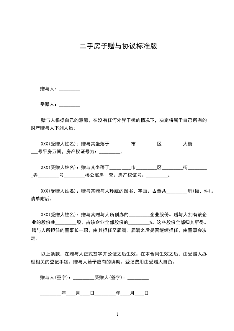 XXX(受赠人姓名):赠与其坐落于_________市_________区_________街_________弄_________号_________楼公寓房一套。房产权证号:_________。