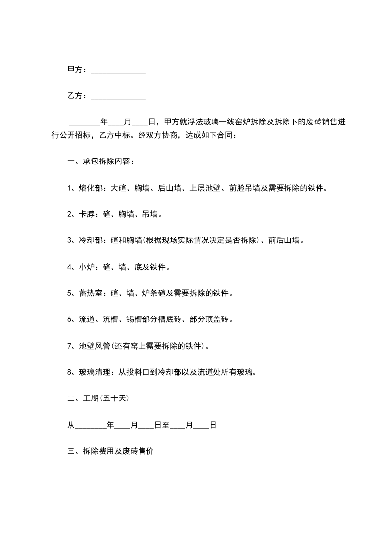________年____月____日,甲方就浮法玻璃一线窑炉拆除及拆除下的废砖销售进行公开招标,乙方中标。经双方协商,达成如下合同: