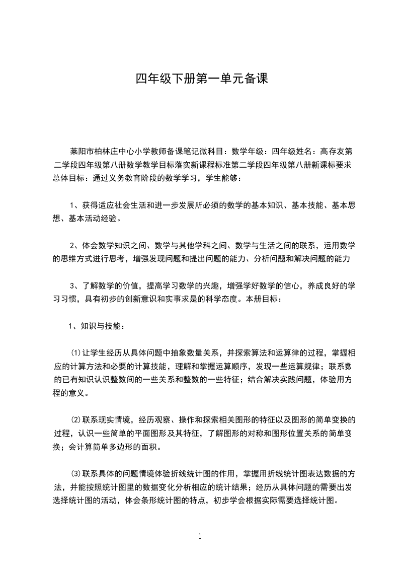 莱阳市柏林庄中心小学教师备课笔记微科目:数学年级:四年级姓名:高存友第二学段四年级第八册数学教学目标落实新课程标准第二学段四年级第八册新课标要求:总体目标:通过义务教育阶段的数学学习,学生能够: