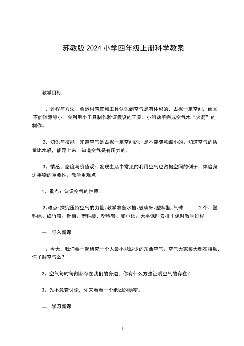 2、难点:探究压缩空气的力量。教学准备水槽、玻璃杯、塑料瓶、气球2个、塑料绳、细竹箝、针筒、塑料袋、塑料管、餐巾纸、天平课时安排1课时教学过程