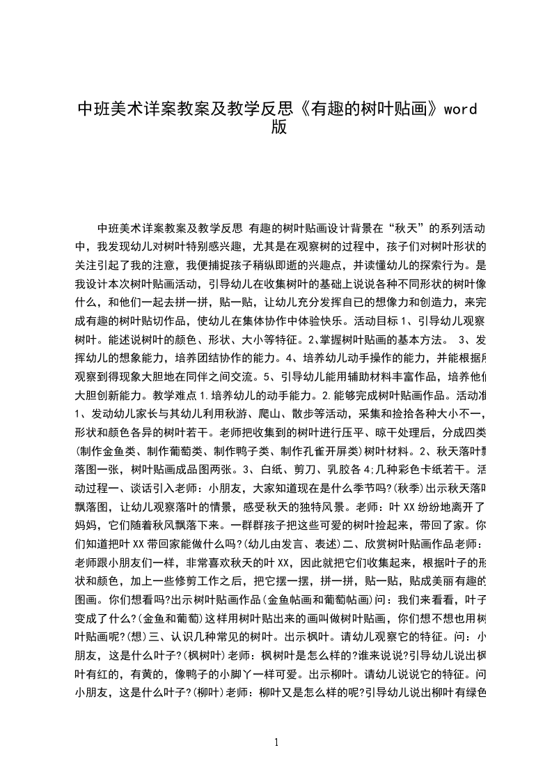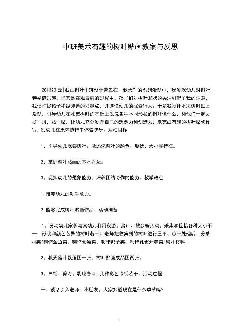 其实,美就在身边。生活中有许许多多像树叶一样的自然材料,如布头,瓜子,蛋壳等,只要我们能像今天这样多观察、多动脑、多动手,将它们拼一拼,剪一剪,贴一贴就一定能做出美妙有趣的东西来。教学反思本次活动能很好的达到目标要求。首先,我设计本次活动的内容对于中班孩子来说是很新鲜的很有吸引力的,因此,幼儿在整个活动过程中兴致高昂,始终保持着浓厚的探究状态,形成活跃的课堂氛围。其次,活动围绕主题环环相扣,形成良好的师幼互动形势。再次,本活动以10个小朋友为一小组进行集体制作,每一位幼儿都能很好地融入其中,提高团结协作的能力,增强幼儿集体荣誉感,作品效果不错。不足之处: