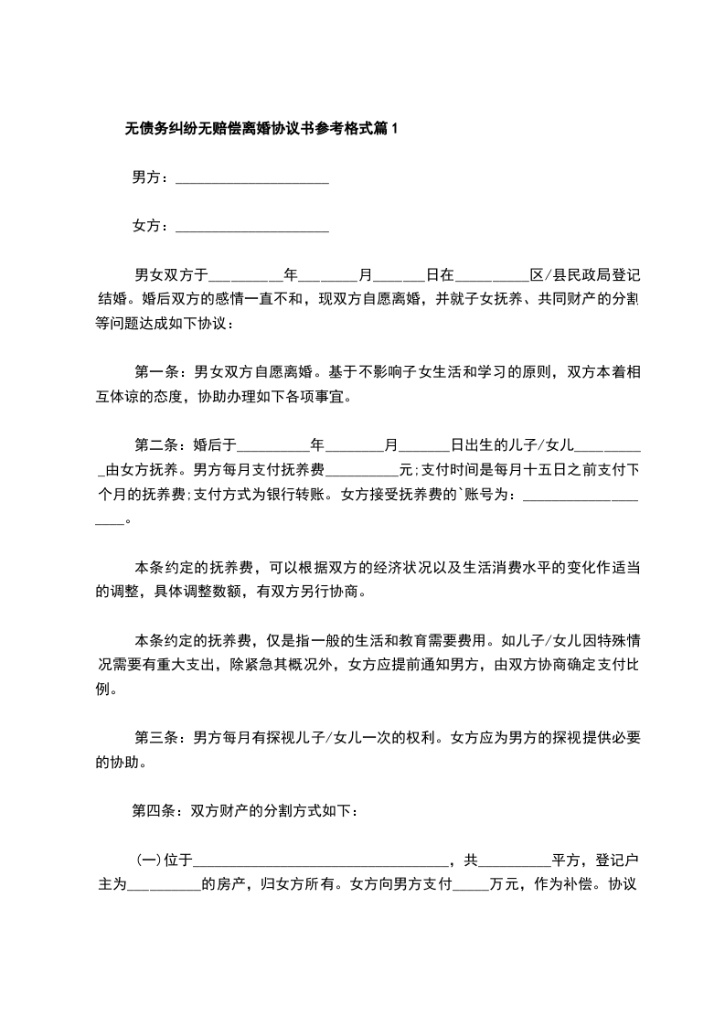 无债务纠纷无赔偿离婚协议书参考格式篇11