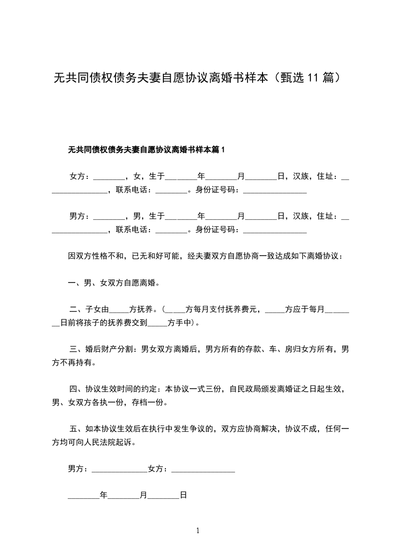 无共同债权债务夫妻自愿协议离婚书样本篇11