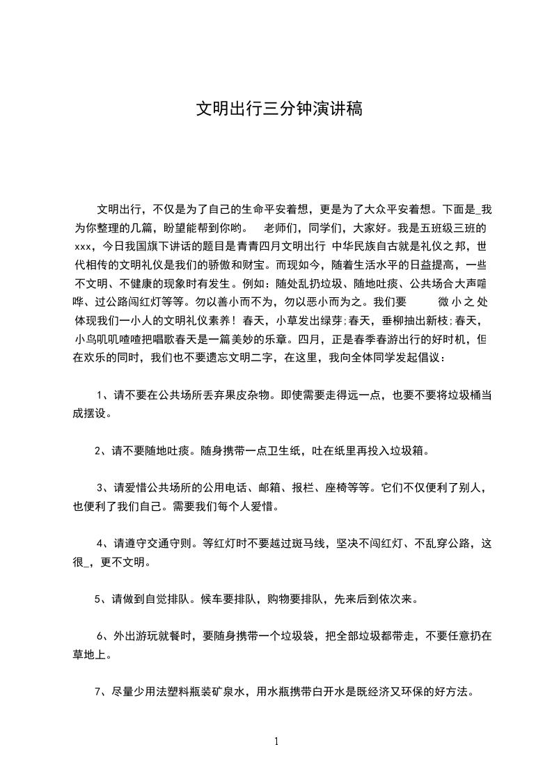 文明出行,不仅是为了自己的生命平安着想,更是为了大众平安着想。下面是_我为你整理的几篇,盼望能帮到你哟。 老师们,同学们,大家好。我是五班级三班的xxx,今日我国旗下讲话的题目是青青四月文明出行 中华民族自古就是礼仪之邦,世代相传的文明礼仪是我们的骄傲和财宝。而现如今,随着生活水平的日益提高,一些不文明、不健康的现象时有发生。例如:随处乱扔垃圾、随地吐痰、公共场合大声喧哗、过公路闯红灯等等。勿以善小而不为,勿以恶小而为之。我们要 微小之处体现我们一小人的文明礼仪素养! 春天,小草发出绿芽;春天,垂柳抽出新枝;春天,小鸟叽叽喳喳把唱歌春天是一篇美妙的乐章。四月,正是春季春游出行的好时机,但在欢乐的同时,我们也不要遗忘文明二字,在这里,我向全体同学发起倡议: