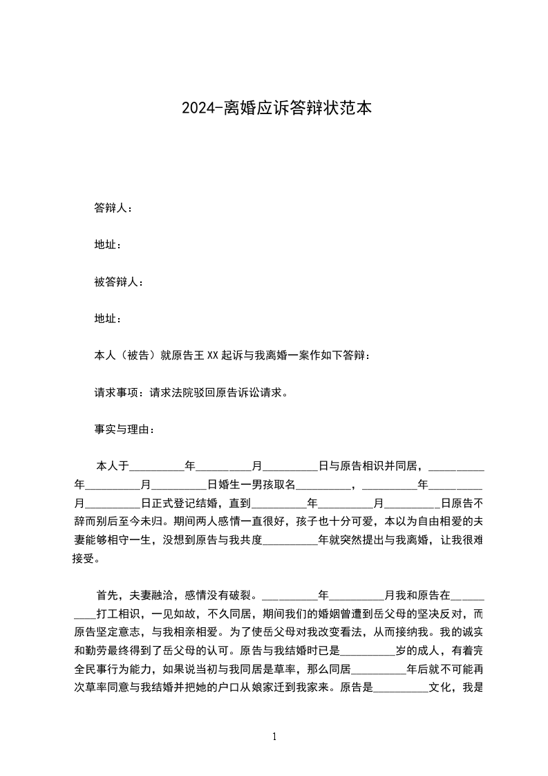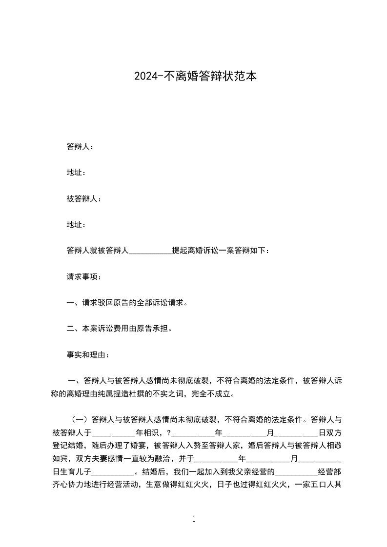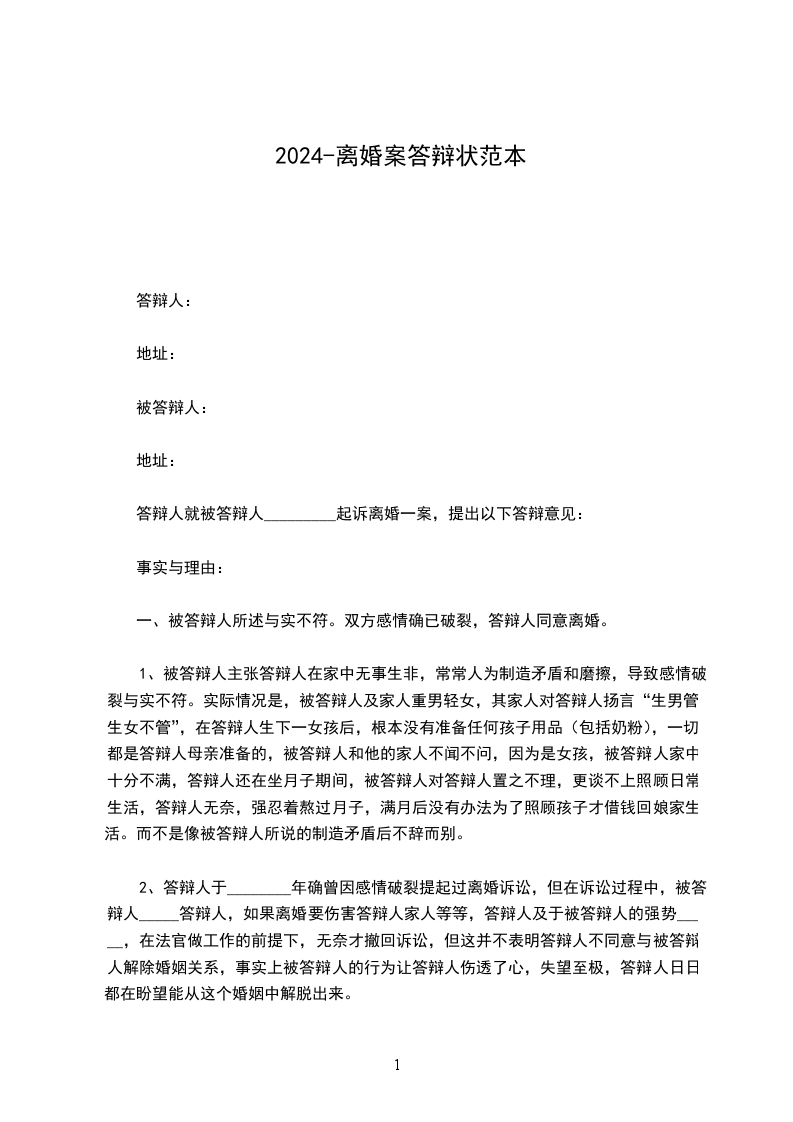 2、被答辩人在起诉状中编造双方自___________年___________月以来分居达二年的情节,是彻头彻尾的谎言,无任何事实依据。事实情况是:答辩人、被答辩人、小孩以及两位老人一家五口人一直其乐融融地生活在一起,我们夫妻也从来没有出现分居的情况。仅仅是___________年___________月,我生孩子前面一段时间,被答辩人无缘无故离家出走了___________多天,至今我也不知道他去了哪里。