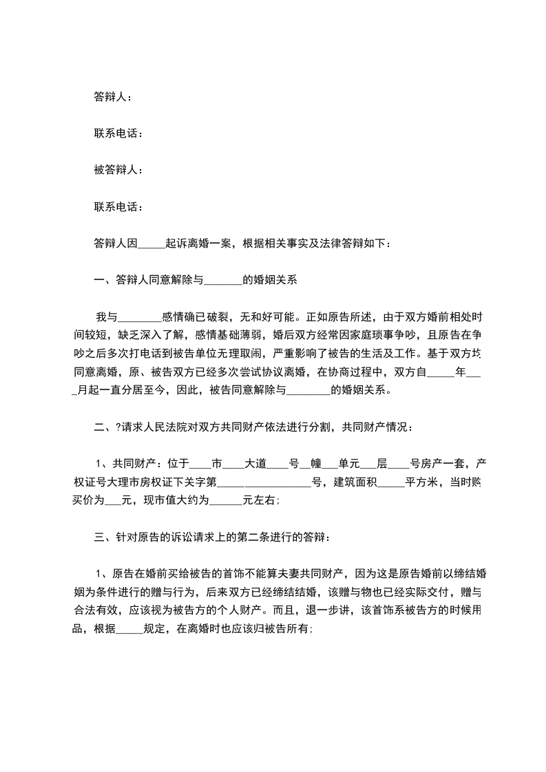答辩人就被答辩人___________提起离婚诉讼一案答辩如下: