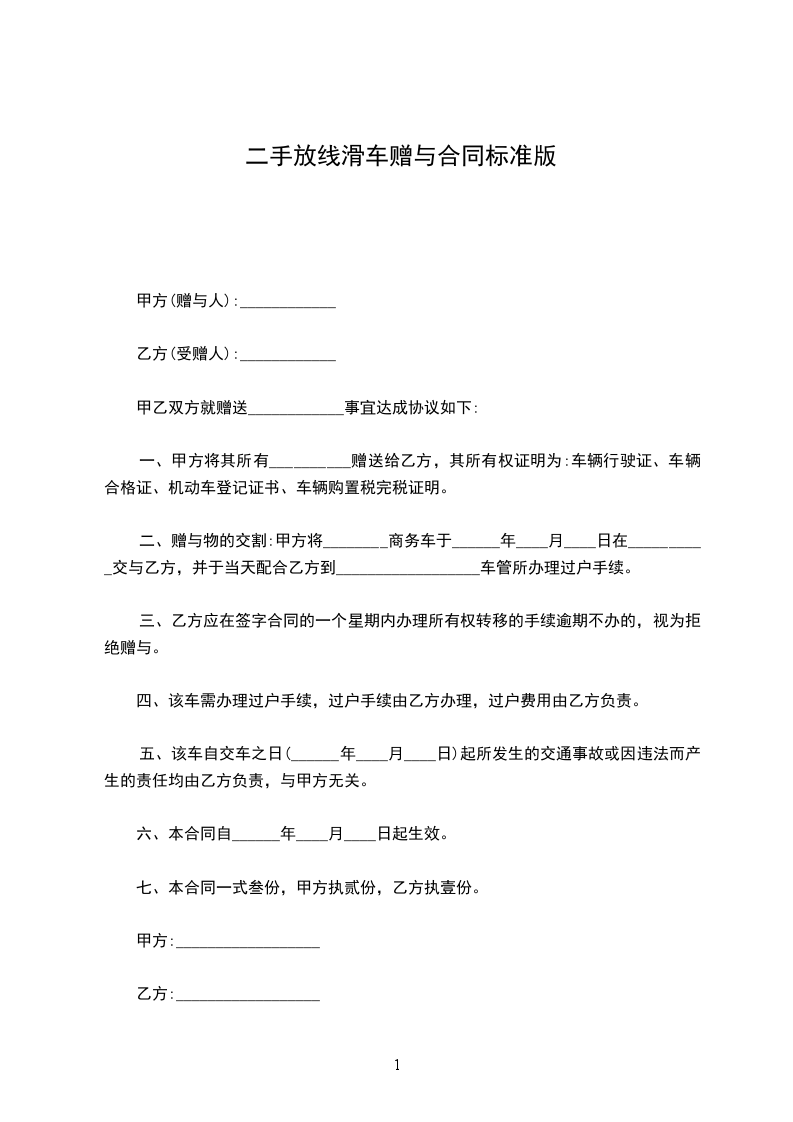 二、赠与物的交割:甲方将________商务车于______年____月____日在__________交与乙方,并于当天配合乙方到__________________车管所办理过户手续。