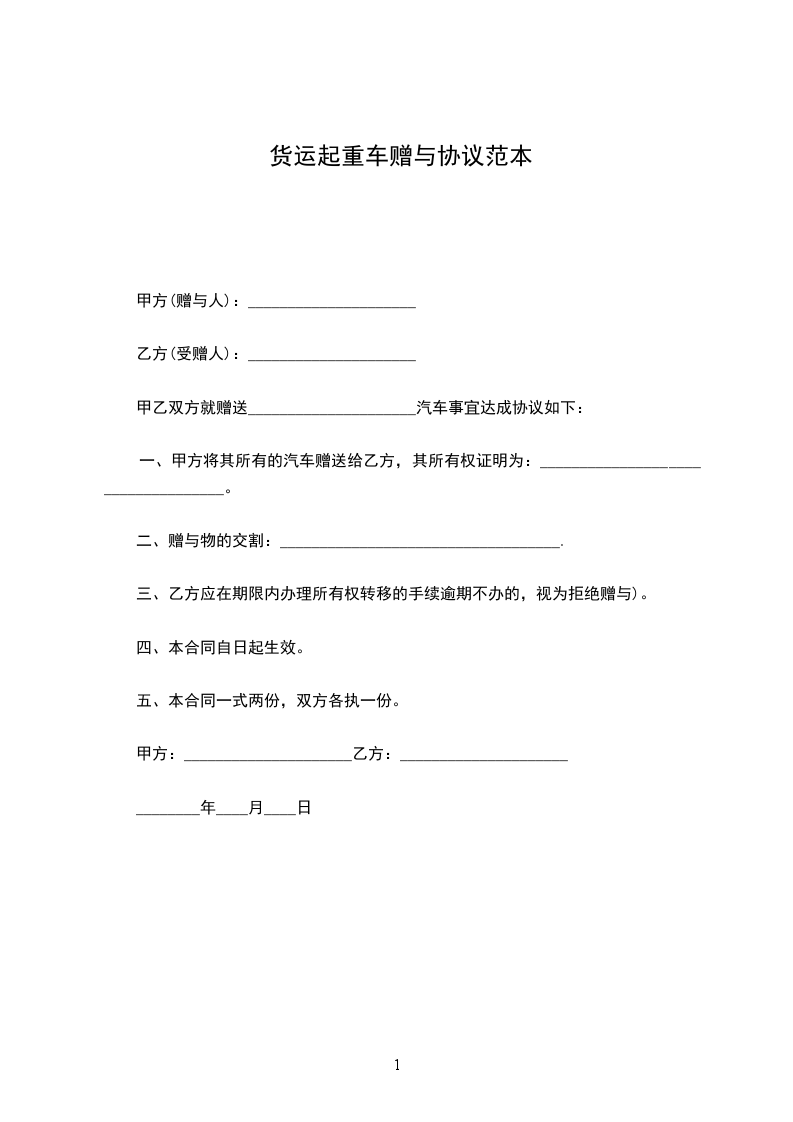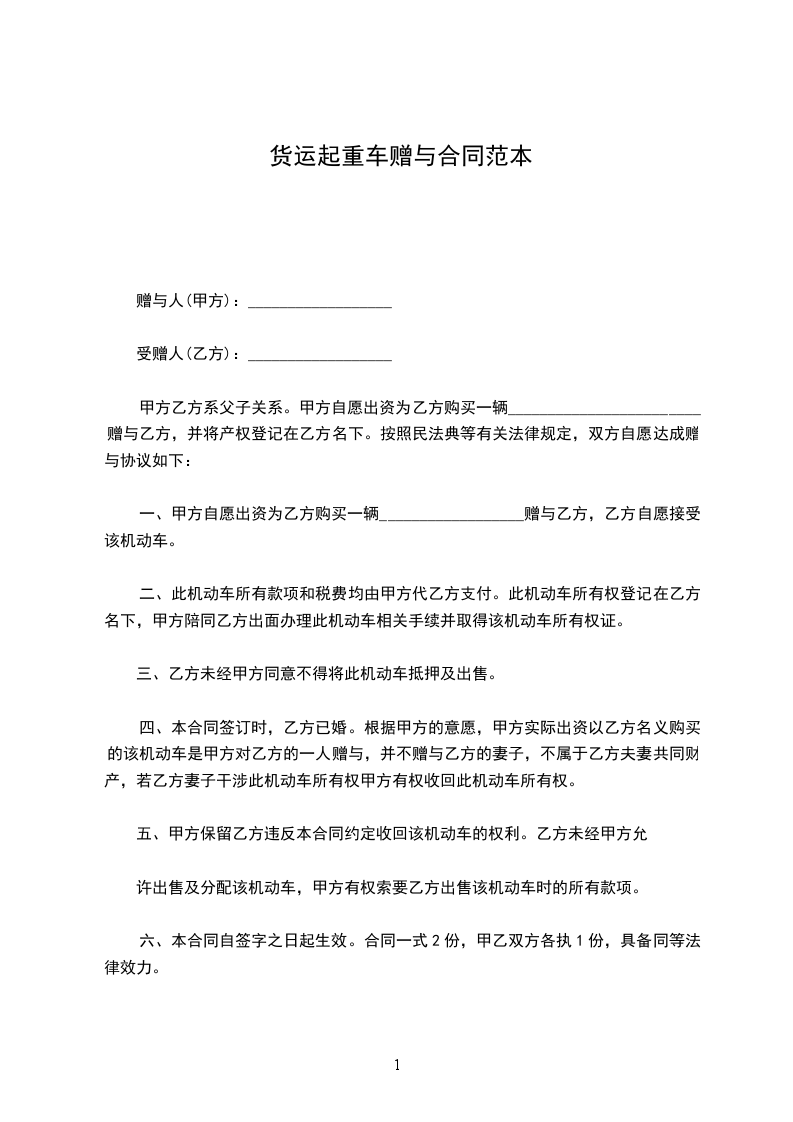 第一条甲方将其所有的________________牌汽车一辆(车牌号:____________________________)无偿赠送给乙方,乙方同意接受赠与。