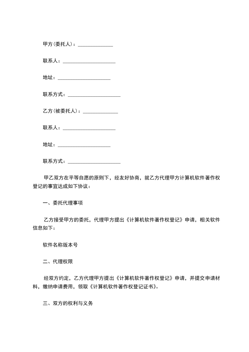 甲乙双方在平等自愿的原则下,经友好协商,就乙方代理甲方计算机软件著作权登记的事宜达成如下协议: