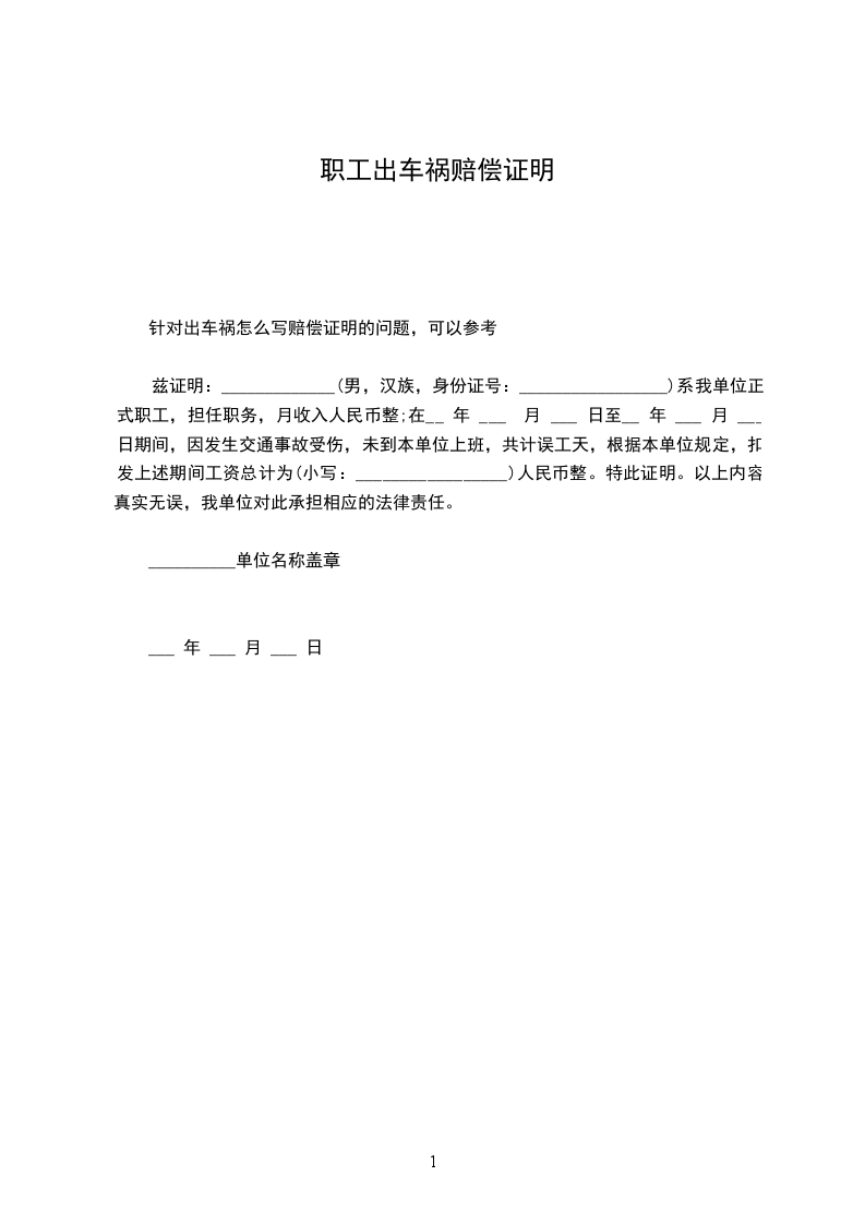 兹证明:_____________(男,汉族,身份证号:_________________)系我单位正式职工,担任职务,月收入人民币整;在__ 年 ___ 月 ___ 日至__ 年 ___ 月 ___ 日期间,因发生交通事故受伤,未到本单位上班,共计误工天,根据本单位规定,扣发上述期间工资总计为(小写:_________________)人民币整。特此证明。以上内容真实无误,我单位对此承担相应的法律责任。