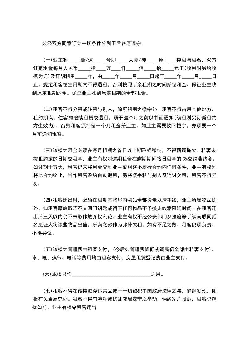 4、房屋只限乙方使用,乙方不得私自转租、改变使用性质或供非法用途。租下本房后,乙方应立即办好租赁登记、暂住人口登记等手续。若发生非法事件,乙方自负后果。