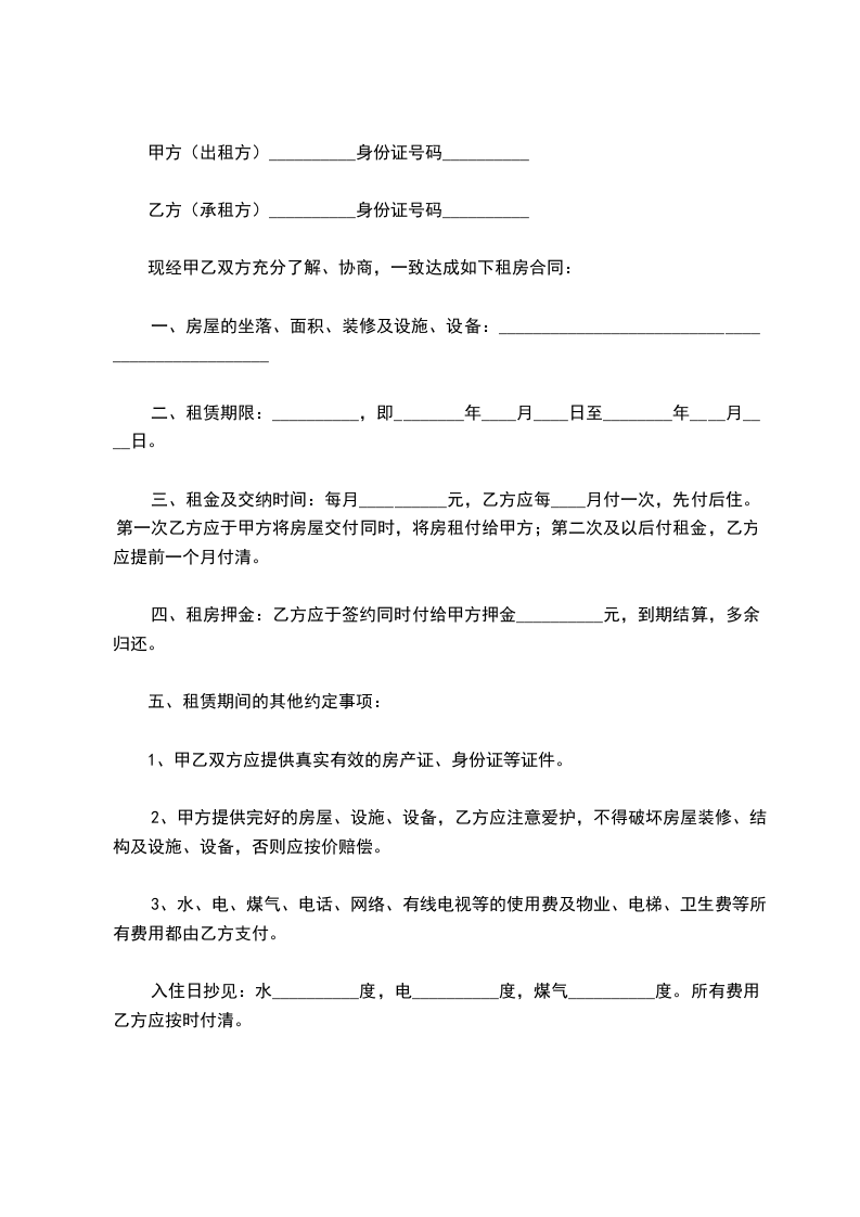 入住日抄见:水__________度,电__________度,煤气__________度。所有费用乙方应按时付清。