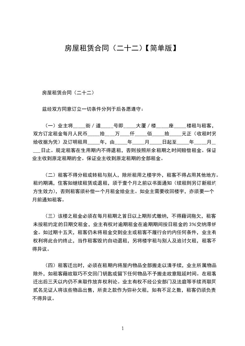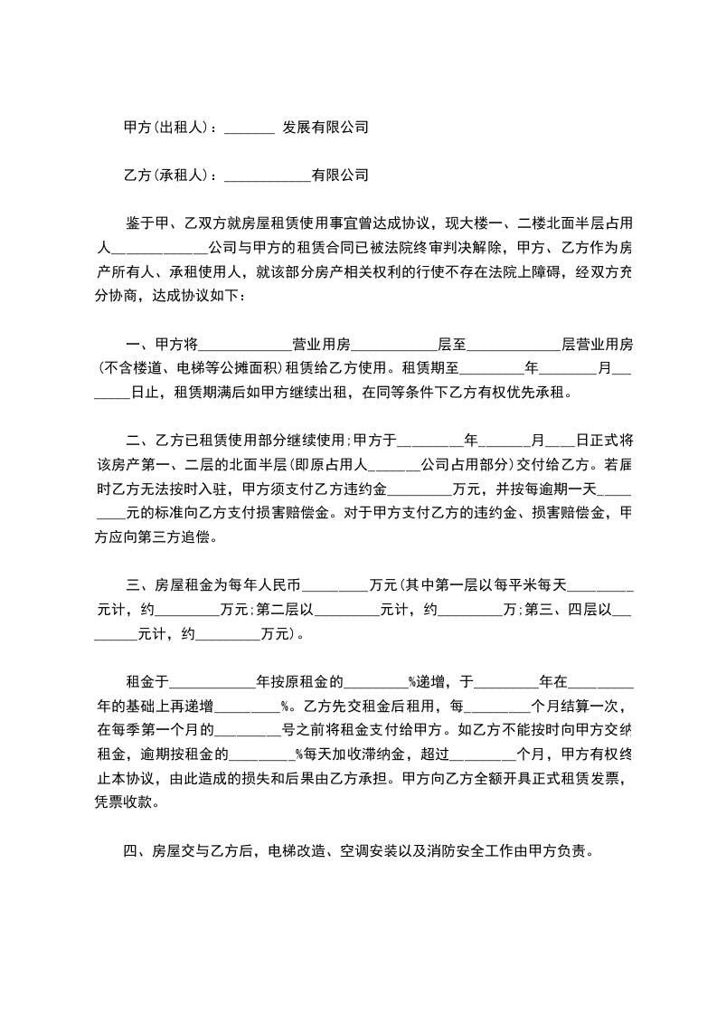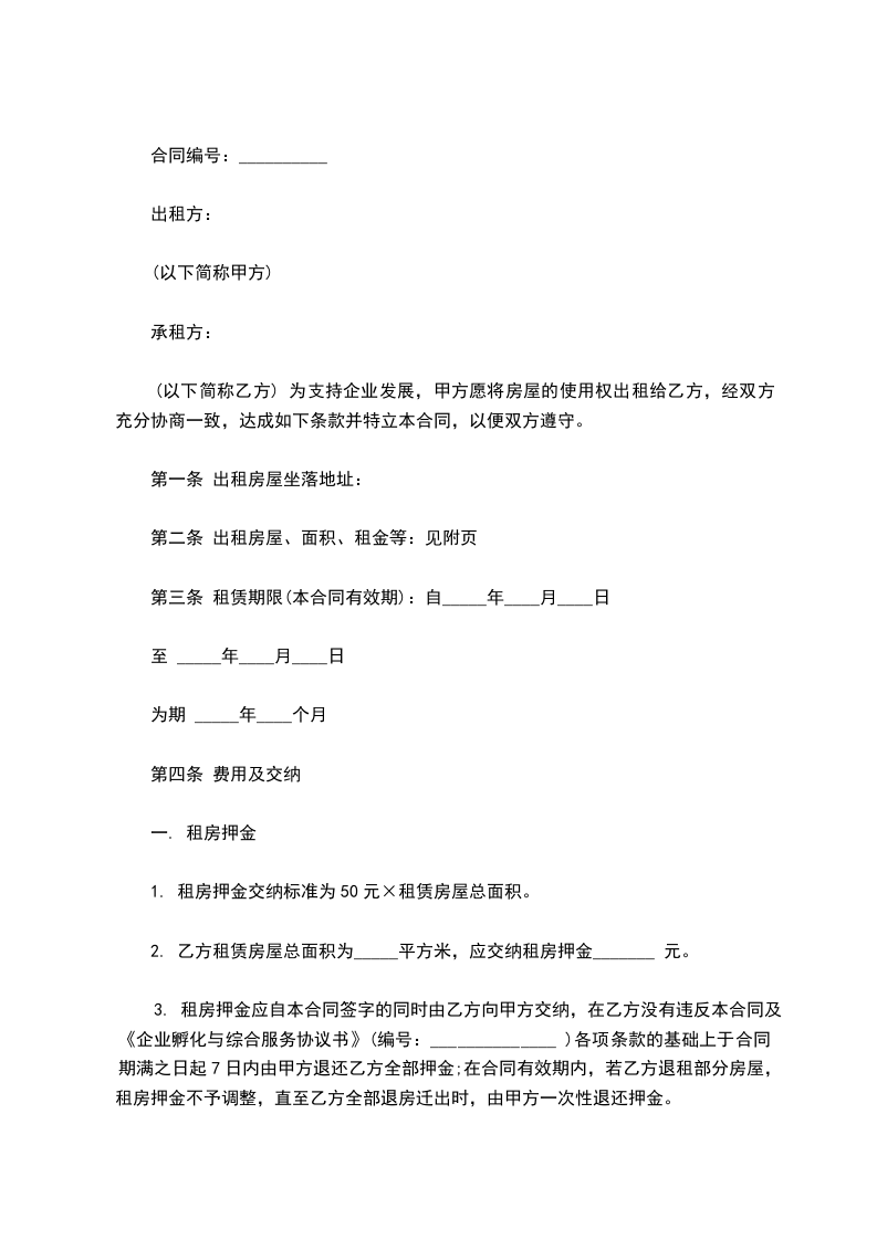 四、租房押金:乙方应于签约同时付给甲方押金__________元,到期结算,多余归还。