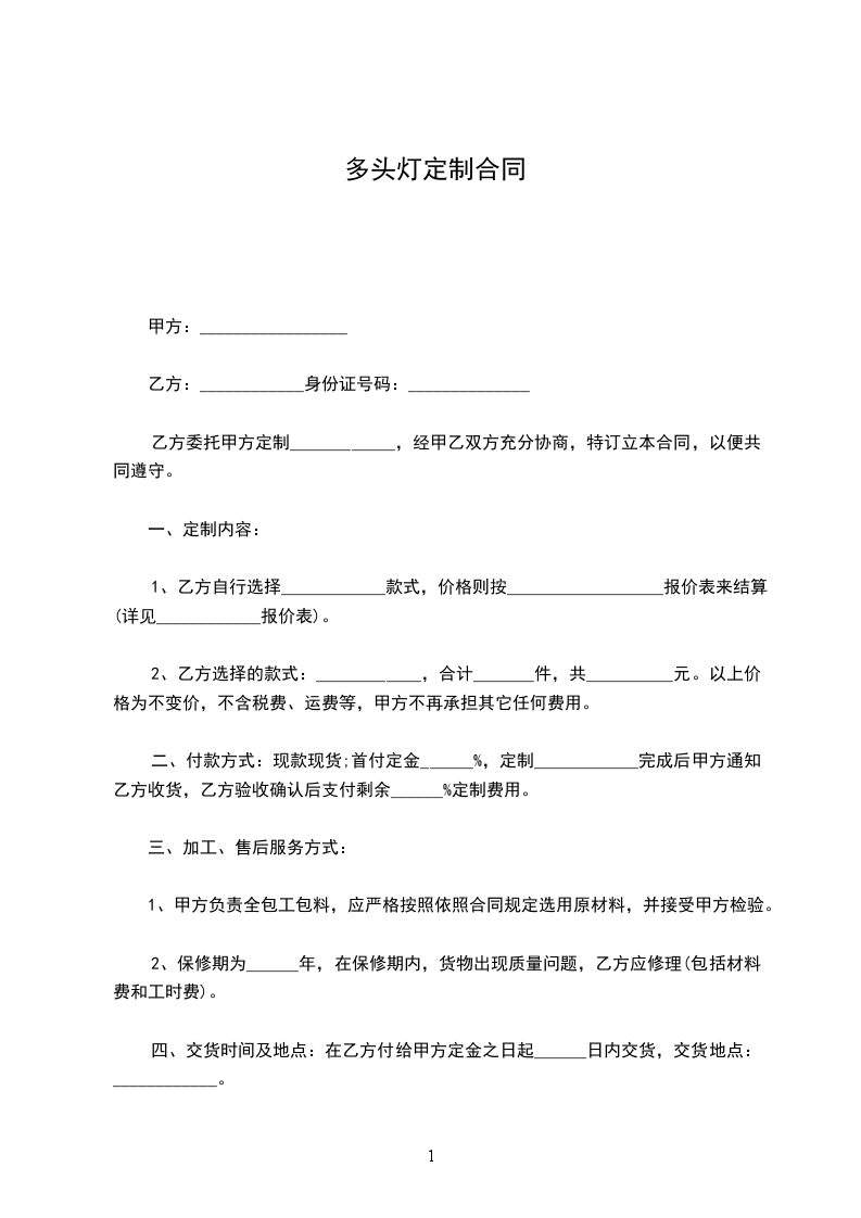 二、付款方式:现款现货;首付定金______%,定制____________完成后甲方通知乙方收货,乙方验收确认后支付剩余______%定制费用。