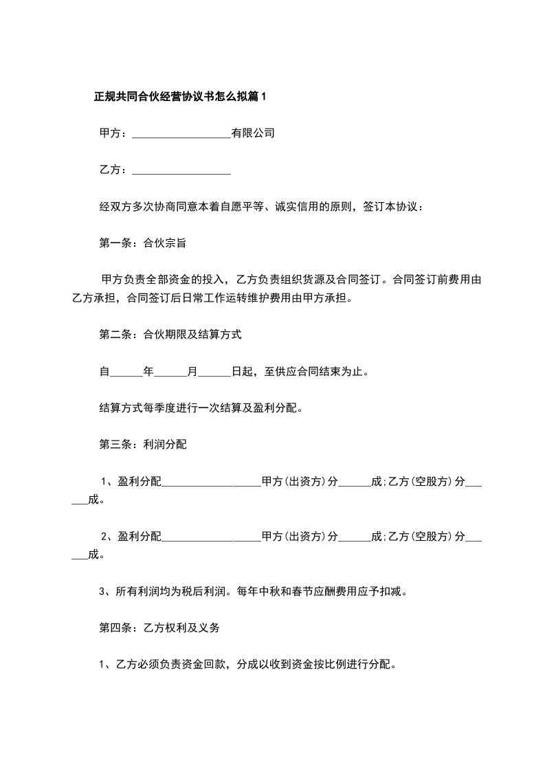 第四条合伙双方共同经营、共同劳动,共担风险,共负盈亏。盈余按照甲百分之五十,乙按照百分之五十比例分配。