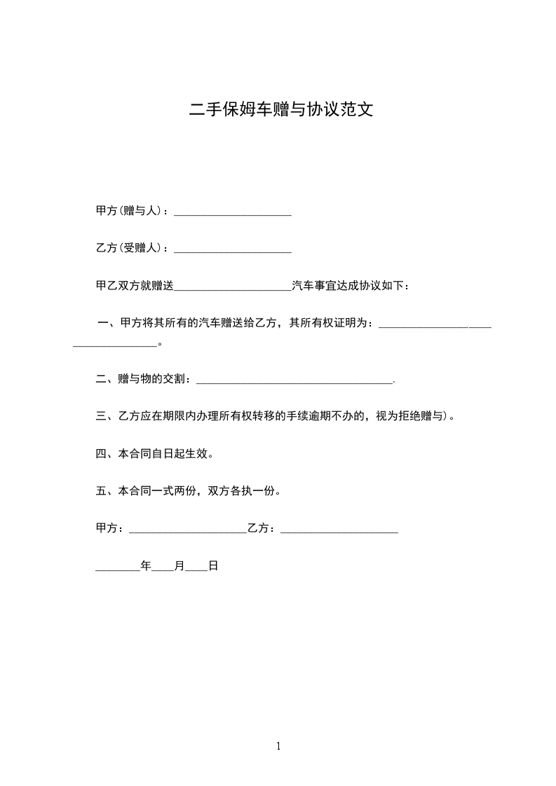 第一条甲方将其所有的__________牌汽车一辆(车牌号:_______________)无偿赠送给乙方,乙方同意接受赠与。