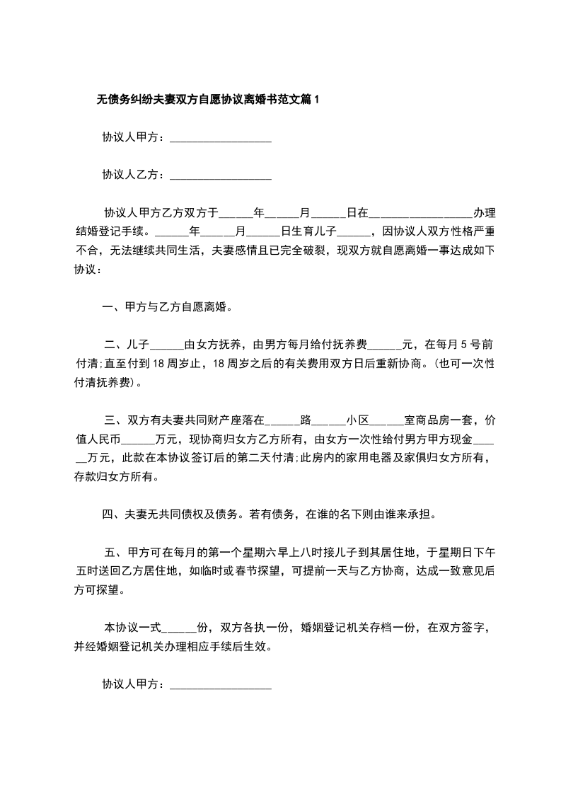 无债务纠纷夫妻自愿协议离婚范本参考样式篇2