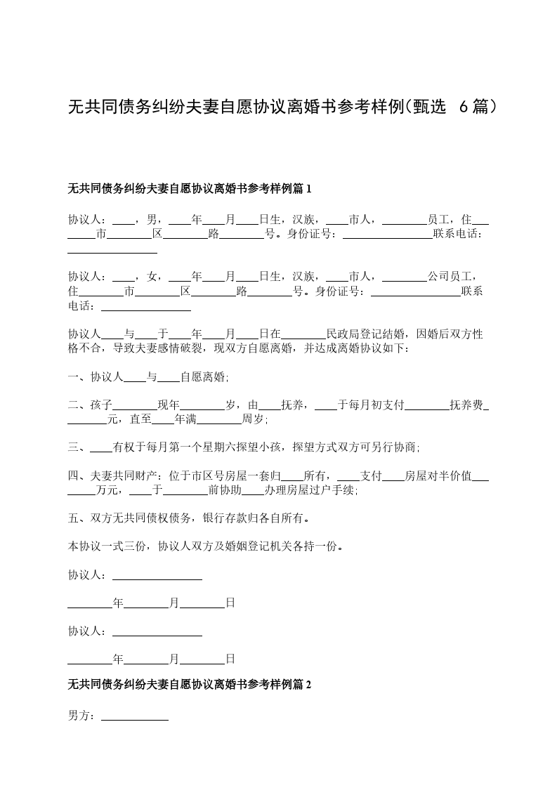 无债务纠纷夫妻自愿协议离婚范本参考样式篇6
