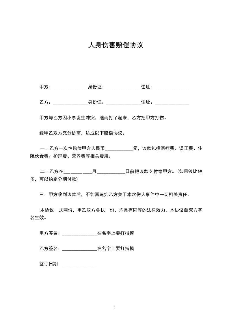 1、自乙方受伤之日起截止本协议签订之日所实际发生的和其它应当由甲方支付的医疗费、交通费等各项费用共计______________元(大写:______________人民币),在本协议签订之前已由甲方全部付清,协议签订之后乙方不得再以任何理由向甲方主张前述期间发生的任何费用。