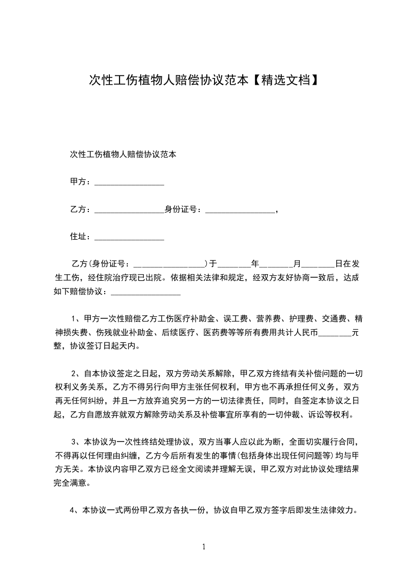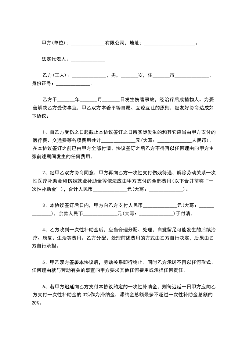 乙方于_______年_______月_______日发生伤害事故,经治疗后成植物人。为妥善解决乙方受伤事宜,甲乙双方本着平等自愿、互谅互让的原则,经友好协商达成如下协议: