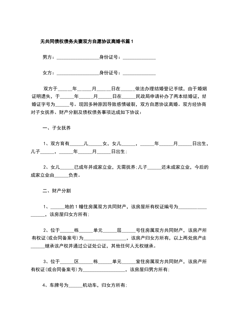 无共同债权债务夫妻双方自愿协议离婚书篇4