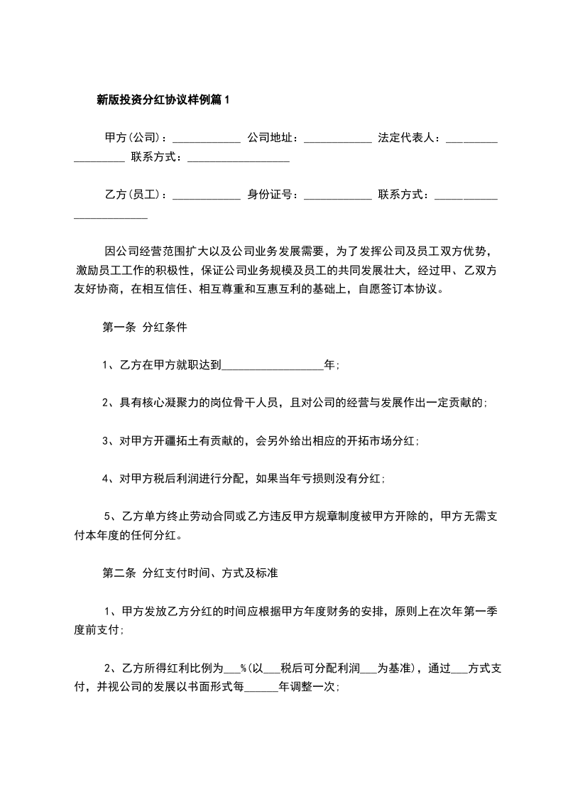 1、在公司经营活动中所得利润扣除各项开支,仍得以盈利的前提下,甲方从盈余中抽取___%的资金将对乙方予以分红。红利支付时间为每年的___月___日,以现金方式支付。