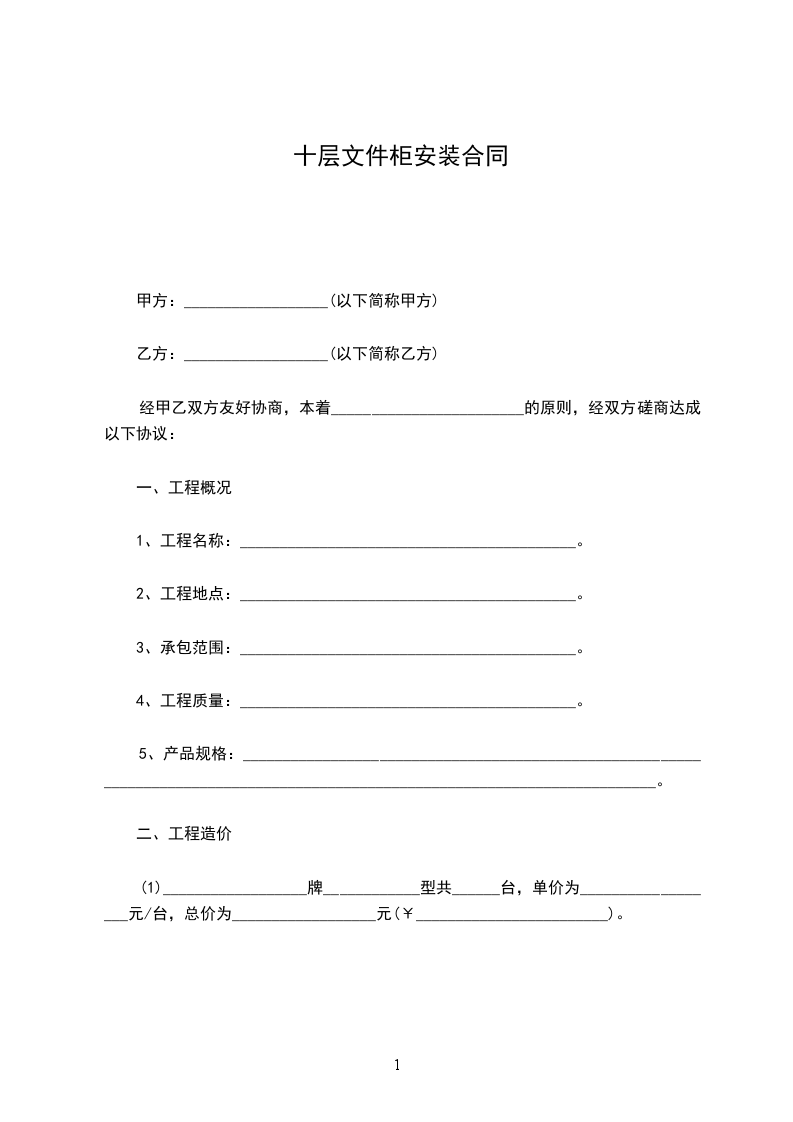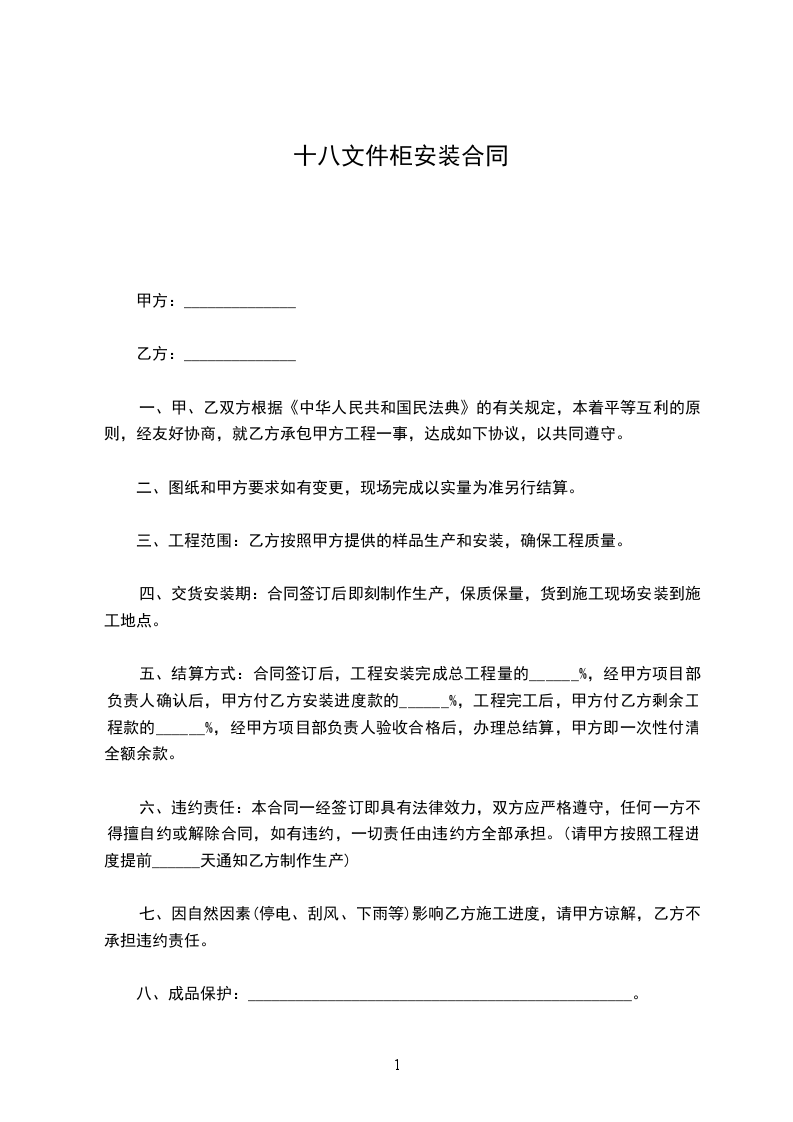 5、工期90天,逾期乙方承担________________________元/天的违约费,如遇雨天等不可抗拒因素,工期顺延。具体安装时间以甲方通知为准。