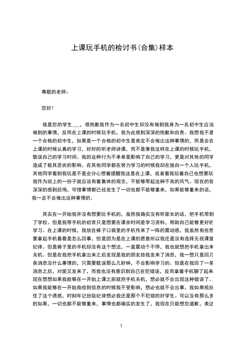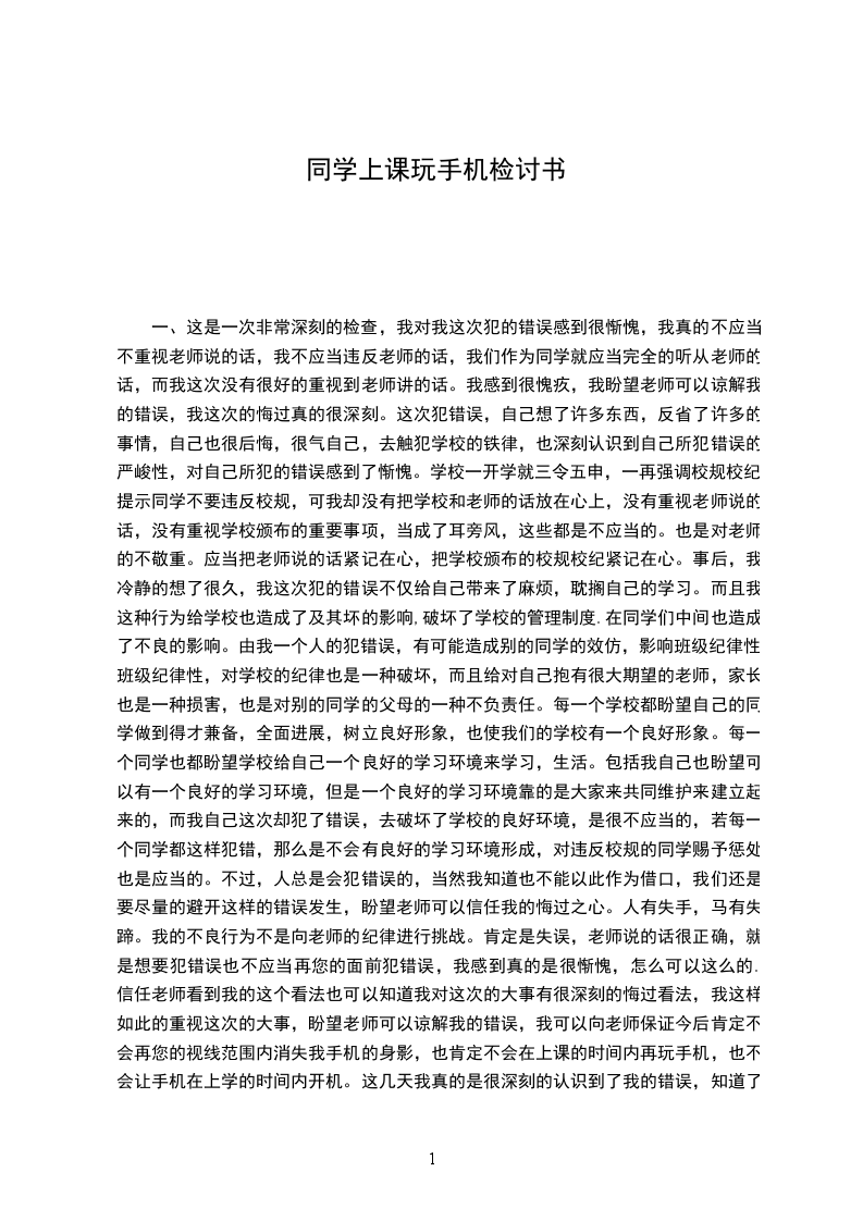 二、我是。今日我怀着无比沉重的心情对昨天上晚自习时玩手机的事情做出了深刻的忏悔,事情的经过是这样的!我在日晚自习没有仔细复习,做作业。在教室玩手机,后来我认识了自己所犯的错误严峻性和后果性!对上课玩手机这种不良的行为我已经有了明确并且深刻的认识,以及再也不在上课的时候玩手机的决心。这是一次非常深刻的自我检查,我对我这次犯的错误感到很惭愧,我真的不应当在晚自习的时候玩手机,我不应当违反吴XX的规定,我们作为同学就应当完全的听从老师的话,何况现在的我已经是一名高校生了,而我这次没有很好的重视到吴XX讲的话,我感到很愧疚,我盼望吴XX可以谅解我这次的错误。人总是会犯错误的,当然我知道也不能以此作为借口,我们还是要尽量的避开这样的错误发生,盼望吴XX可以信任我的悔过之心。人有失手,马有失蹄。我的不良行为不是向老师的纪律进行挑战。肯定是失误,这次是由我把其他同学的手机拿来看照片,完全没有意识到这是在上课时间,所以才会有这种事情发生,吴XX说的话很正确,就是想要犯错误也不应当再您的面前犯错误,我真的感到很惭愧。我对这次的大事有很深刻的悔过看法,盼望吴XX可以谅解我的错误,我可以向老师保证今后肯定不会在晚自习玩手机。经过一天的时间我真的是很深刻的认识到了我的错误,知道老师说的话就要听从,吴XX对我们所提的要求都是为了我们同学好,所以我们不能挑战老师的纪律,我们是同学,没有力量对老师说出来的话产生不听从的想法,我们唯一可以做的事情就是好好的听从老师的话,好好的学习好,让老师可以放心。犯了这样希的错误,我信任对父母对我的期望也是一种很大的打击,父母辛辛苦苦的赚钱,让我在学校认仔细真的上学,可是,我却违反了父母的心愿,我犯了这样的错误,简直是对父母心血的否定,我对此也感到很惭愧,父母的劳累是我们所不知道的,每天为了生存而劳碌,为了家庭而承受着巨大的压力,这一切的一切都是我们所不能够了解的,我唯一可以做的就是做他们的乖孩子,听从他们的话,他们是我最亲的人,也是我在现在这个_上最可以信任的人,所以我就要尽量的避开家长生气,不给他们带来不必要的苦恼。而我作为他们最亲的人也不能够惹他们生气,这个都是相互的,当我损害到他们的心时,也是对自己心的损害,由我们是最亲的人。没有任何人可以取代。这次的大事我真的感到愧疚,盼望吴XX可以谅解我。也盼望同学也要引以为戒,不要犯和我一样愚蠢的错误了,这次的教训真的很深刻。错误的性质是严峻的。我在上课的时候玩手机,这种行为,即使是并没有影响课堂纪律,仍旧是不对的,此举本身就是违反了做同学的原则。我只是顾着自己的一时兴奋,和一时的想法,完全没有考虑到这样做是不正确的。作为一名当代高校生,一名正在接受训练的人并且即将成为从事老师行业的我来说,这种表现明显不符合_对我们的要求。再次,我这种行为还在学校同学间造成了及其坏的影响,破坏了学校的形象。其实当时我怀着一种吴XX不会发觉的侥幸心理,所以才酿成了现在的后果。晚自习是让同学复习一天的学习的课,不论是什么缘由在上课的时候玩手机都是很不对的,违反了做同学的原则。鲁X先生说过:不友善的关心就是恶意的损害。我只有仔细反思,查找错误后面的深刻根源,认清问题的本质,才能给集体和自己一个交待,从而得以进步。做为一名高校生我没有做好自己的本职,本应当在上课的时候决不玩手机,而我却在上课的时候玩手机了,辜负了老师对我们一次又一次的期望。经过这么多个小时的深刻反思我已经认识到这件事情的严峻性,老师训练我们也是盼望我们在以后的道路上能走得更好、走的更远。所以我今后要谨遵吴XX的教导,充分领悟并理解老师对我们的要求,并保证不会在有类似的事情发生。一个人的成长和进步,不仅仅是学业上的提高,更重要的是思想、作风方面上的培育和锤炼。我忽视了这样一个重要的问题,为此而犯了方向性的错误。我所犯错误的影响是很坏的。总之,我为自己所犯的错误而带来的这一切而深感痛心和懊悔。我所犯的错误教训是深刻的。对这一切我还将进一步深化总结,深刻反省,恳请吴XX信任我能够记取教训、改正错误,今后绝不犯类似的错误。我已经意识到我必需对自己的人生负责,对_负责,增加自己的掌握力,不断自我约束。做好课堂上应作的每件事,遵守课堂纪律,不辜负老师对我们的期望。放纵是件很简单的事情,对诱惑说不,担负责任才是最困难的事,我情愿借此事给自己提出挑战,从而达到不断的完善。最终感谢大家情愿接受并查看我的状况说明。