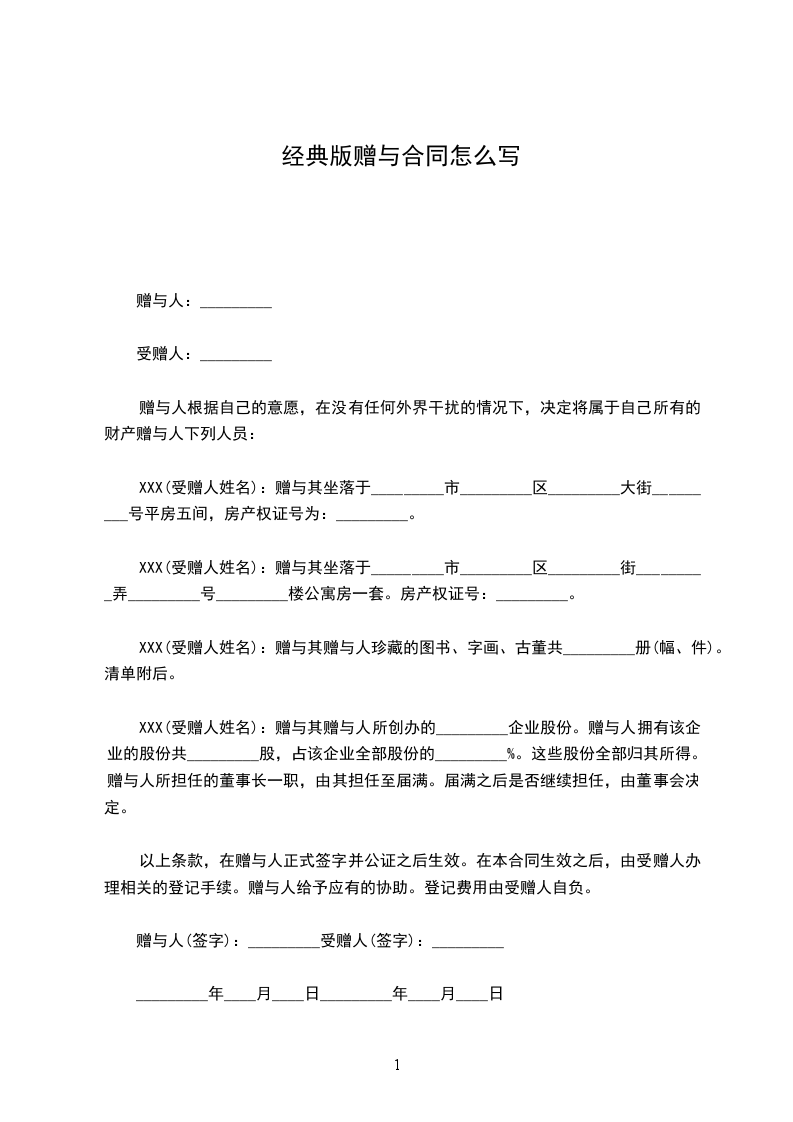 XXX(受赠人姓名):赠与其赠与人所创办的_________企业股份。赠与人拥有该企业的股份共_________股,占该企业全部股份的_________%。这些股份全部归其所得。赠与人所担任的董事长一职,由其担任至届满。届满之后是否继续担任,由董事会决定。