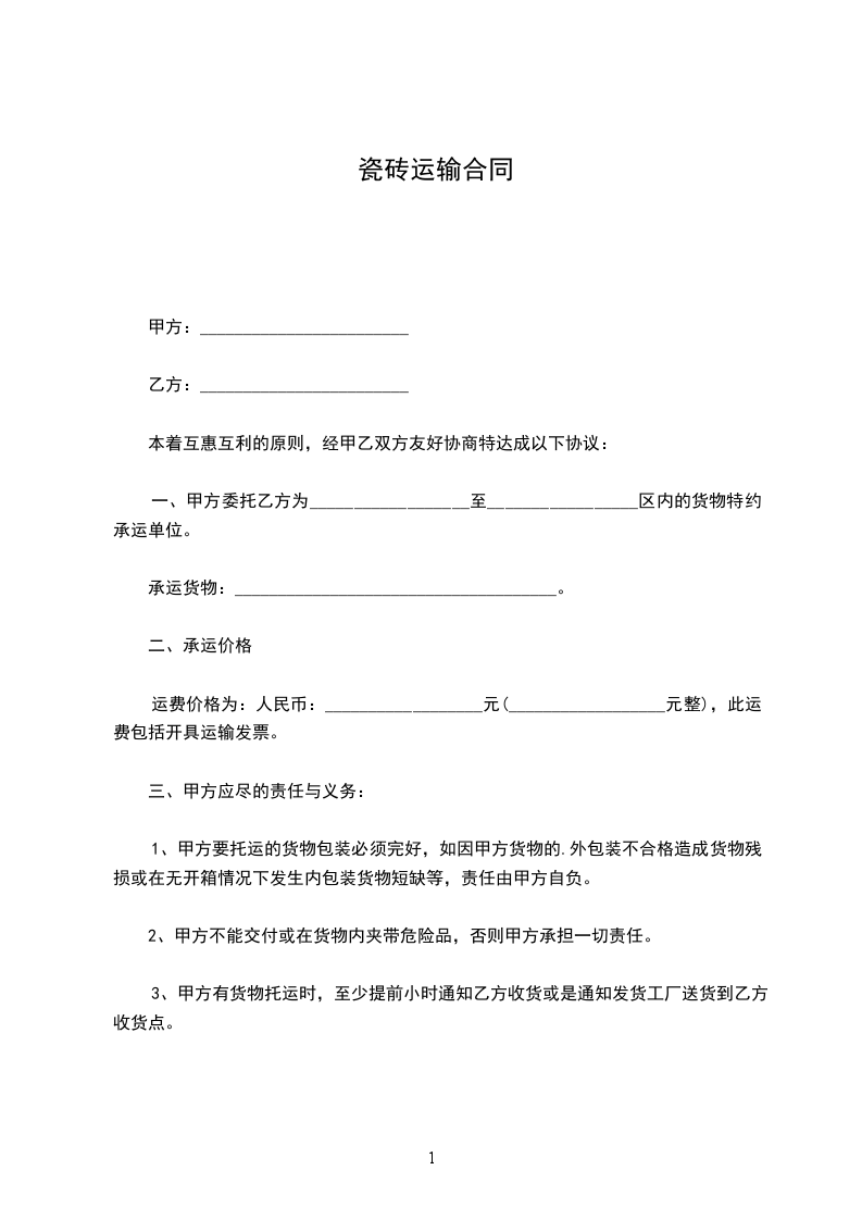 一、甲方委托乙方为__________________至_________________区内的货物特约承运单位。