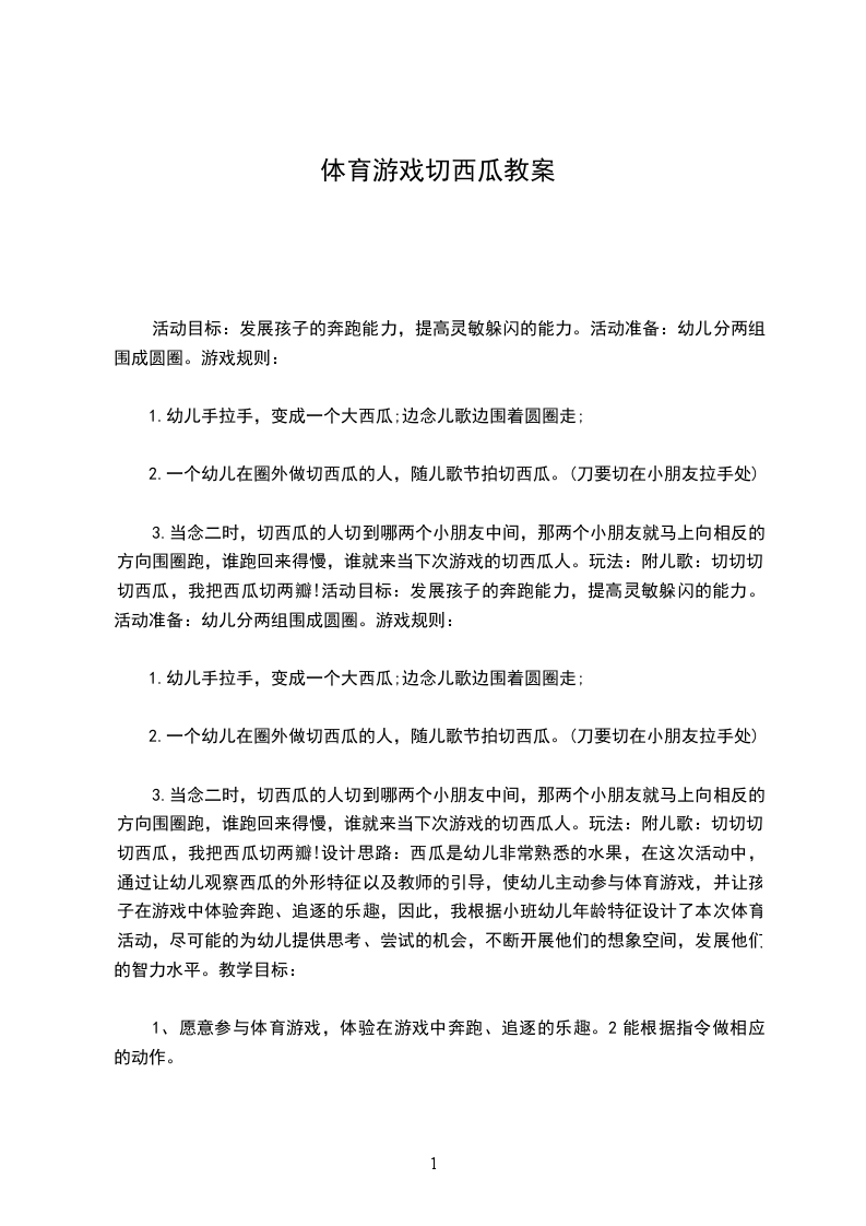 3.当念二时,切西瓜的人切到哪两个小朋友中间,那两个小朋友就马上向相反的方向围圈跑,谁跑回来得慢,谁就来当下次游戏的切西瓜人。玩法:附儿歌:切切切,切西瓜,我把西瓜切两瓣!设计思路:西瓜是幼儿非常熟悉的水果,在这次活动中,通过让幼儿观察西瓜的外形特征以及教师的引导,使幼儿主动参与体育游戏,并让孩子在游戏中体验奔跑、追逐的乐趣,因此,我根据小班幼儿年龄特征设计了本次体育活动,尽可能的为幼儿提供思考、尝试的机会,不断开展他们的想象空间,发展他们的智力水平。教学目标: