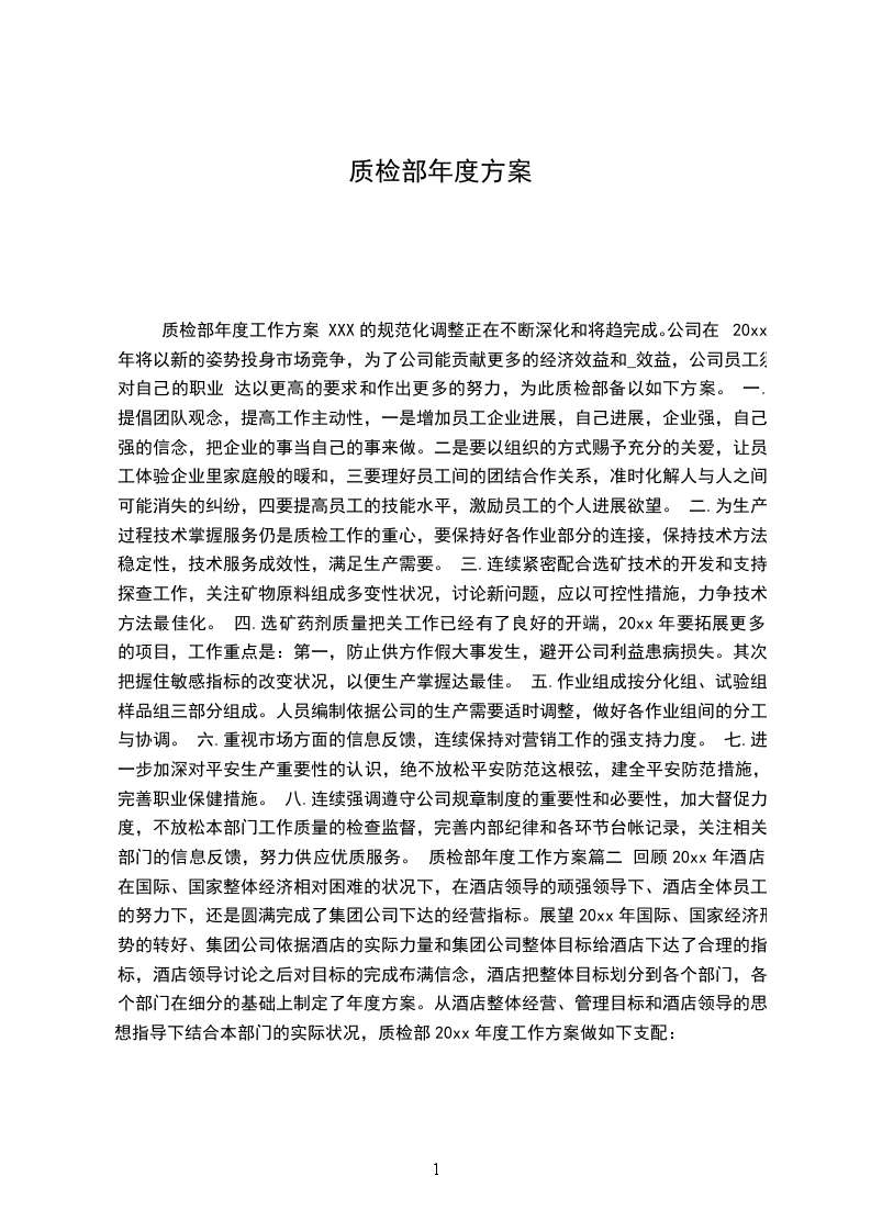 质检部年度工作方案 XXX的规范化调整正在不断深化和将趋完成。公司在20xx年将以新的姿势投身市场竞争,为了公司能贡献更多的经济效益和_效益,公司员工须对自己的职业 达以更高的要求和作出更多的努力,为此质检部备以如下方案。 一.提倡团队观念,提高工作主动性,一是增加员工企业进展,自己进展,企业强,自己强的信念,把企业的事当自己的事来做。二是要以组织的方式赐予充分的关爱,让员工体验企业里家庭般的暖和,三要理好员工间的团结合作关系,准时化解人与人之间可能消失的纠纷,四要提高员工的技能水平,激励员工的个人进展欲望。 二.为生产过程技术掌握服务仍是质检工作的重心,要保持好各作业部分的连接,保持技术方法稳定性,技术服务成效性,满足生产需要。 三.连续紧密配合选矿技术的开发和支持探查工作,关注矿物原料组成多变性状况,讨论新问题,应以可控性措施,力争技术方法最佳化。 四.选矿药剂质量把关工作已经有了良好的开端,20xx年要拓展更多的项目,工作重点是:第一,防止供方作假大事发生,避开公司利益患病损失。其次,把握住敏感指标的改变状况,以便生产掌握达最佳。 五.作业组成按分化组、试验组、样品组三部分组成。人员编制依据公司的生产需要适时调整,做好各作业组间的分工与协调。 六.重视市场方面的信息反馈,连续保持对营销工作的强支持力度。 七.进一步加深对平安生产重要性的认识,绝不放松平安防范这根弦,建全平安防范措施,完善职业保健措施。 八.连续强调遵守公司规章制度的重要性和必要性,加大督促力度,不放松本部门工作质量的检查监督,完善内部纪律和各环节台帐记录,关注相关部门的信息反馈,努力供应优质服务。 质检部年度工作方案篇二 回顾20xx年酒店在国际、国家整体经济相对困难的状况下,在酒店领导的顽强领导下、酒店全体员工的努力下,还是圆满完成了集团公司下达的经营指标。展望20xx年国际、国家经济形势的转好、集团公司依据酒店的实际力量和集团公司整体目标给酒店下达了合理的指标,酒店领导讨论之后对目标的完成布满信念,酒店把整体目标划分到各个部门,各个部门在细分的基础上制定了年度方案。从酒店整体经营、管理目标和酒店领导的思想指导下结合本部门的实际状况,质检部20xx年度工作方案做如下支配: