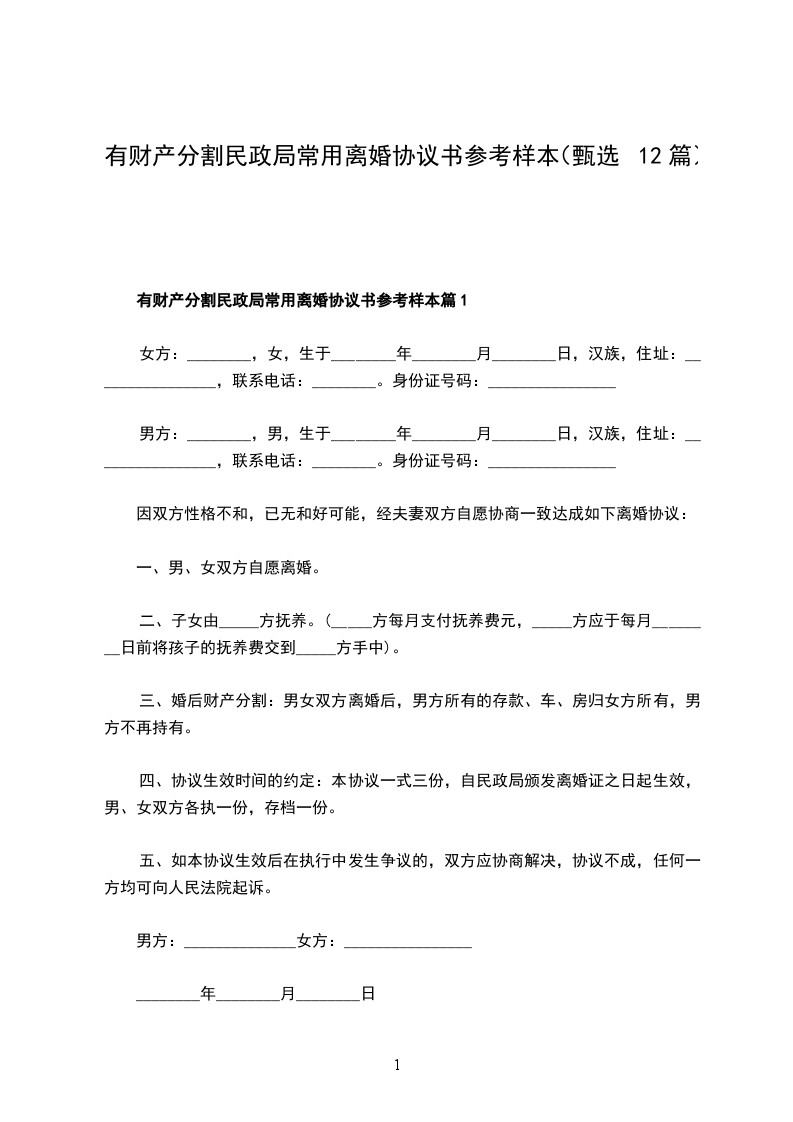 有财产分割民政局常用离婚协议书参考样本篇12