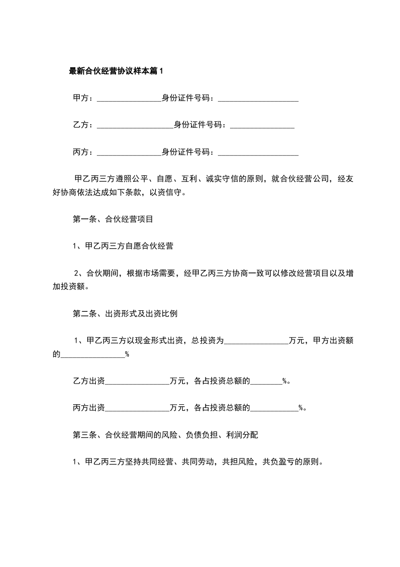 最新合伙经营协议样本篇1