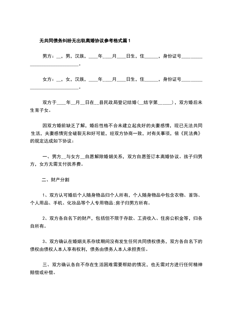 无共同债务纠纷无出轨离婚协议参考样本篇1