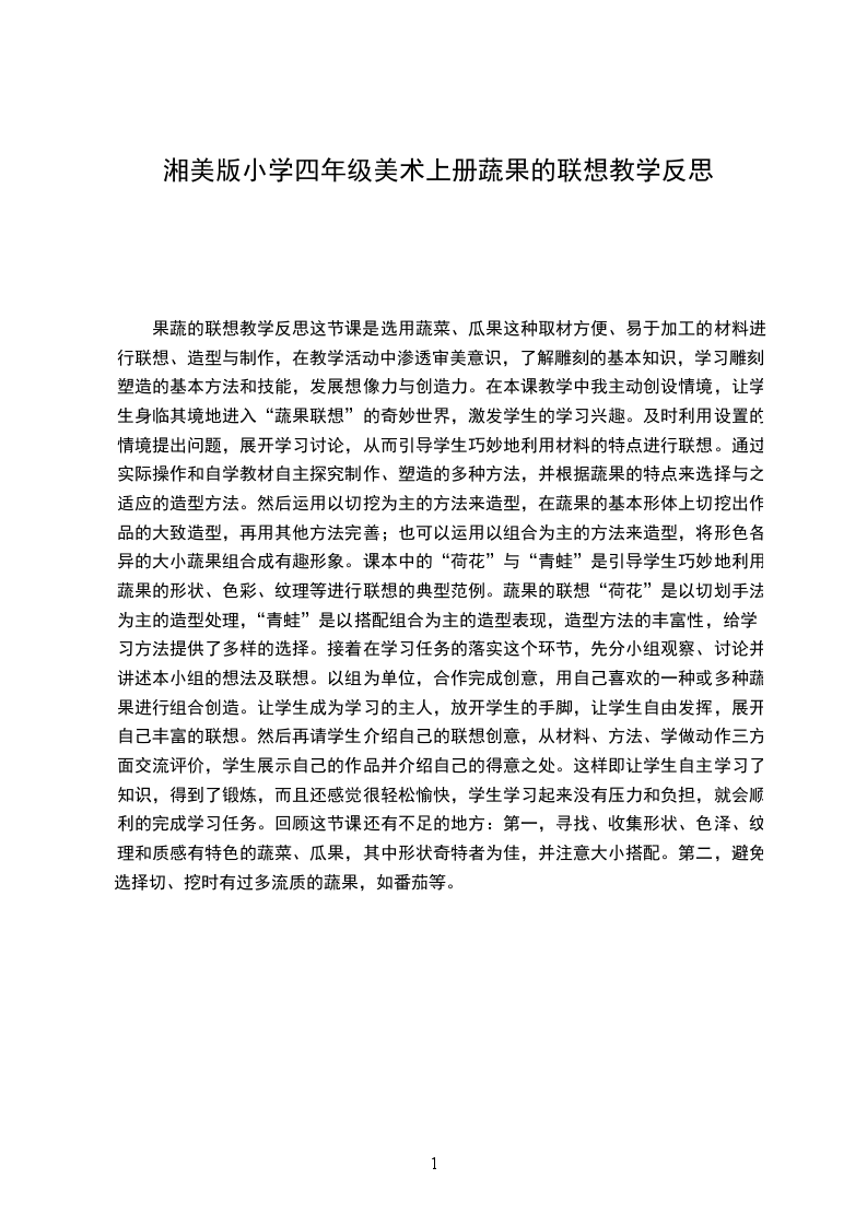 果蔬的联想教学反思这节课是选用蔬菜、瓜果这种取材方便、易于加工的材料进行联想、造型与制作,在教学活动中渗透审美意识,了解雕刻的基本知识,学习雕刻、塑造的基本方法和技能,发展想像力与创造力。在本课教学中我主动创设情境,让学生身临其境地进入“蔬果联想”的奇妙世界,激发学生的学习兴趣。及时利用设置的情境提出问题,展开学习讨论,从而引导学生巧妙地利用材料的特点进行联想。通过实际操作和自学教材自主探究制作、塑造的多种方法,并根据蔬果的特点来选择与之适应的造型方法。然后运用以切挖为主的方法来造型,在蔬果的基本形体上切挖出作品的大致造型,再用其他方法完善;也可以运用以组合为主的方法来造型,将形色各异的大小蔬果组合成有趣形象。课本中的“荷花”与“青蛙”是引导学生巧妙地利用蔬果的形状、色彩、纹理等进行联想的典型范例。蔬果的联想“荷花”是以切划手法为主的造型处理,“青蛙”是以搭配组合为主的造型表现,造型方法的丰富性,给学习方法提供了多样的选择。接着在学习任务的落实这个环节,先分小组观察、讨论并讲述本小组的想法及联想。以组为单位,合作完成创意,用自己喜欢的一种或多种蔬果进行组合创造。让学生成为学习的主人,放开学生的手脚,让学生自由发挥,展开自己丰富的联想。然后再请学生介绍自己的联想创意,从材料、方法、学做动作三方面交流评价,学生展示自己的作品并介绍自己的得意之处。这样即让学生自主学习了知识,得到了锻炼,而且还感觉很轻松愉快,学生学习起来没有压力和负担,就会顺利的完成学习任务。回顾这节课还有不足的地方:第一,寻找、收集形状、色泽、纹理和质感有特色的蔬菜、瓜果,其中形状奇特者为佳,并注意大小搭配。第二,避免选择切、挖时有过多流质的蔬果,如番茄等。