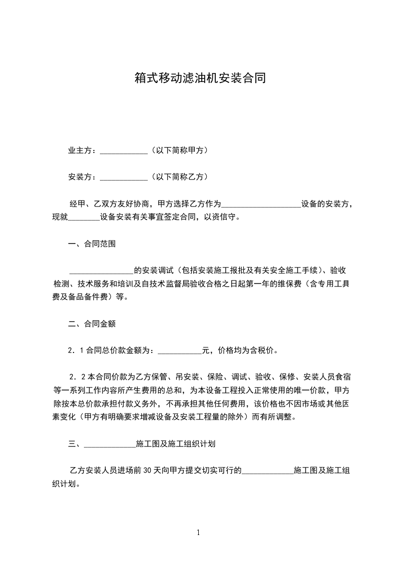 箱式移动滤油机安装合同