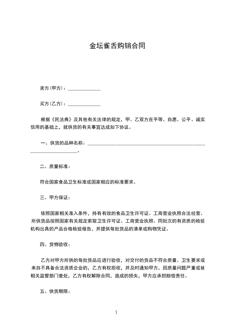 1、甲方所供食品,必须符合食品标准,如出现食品卫生质量问题,乙方无条件退货或换货。