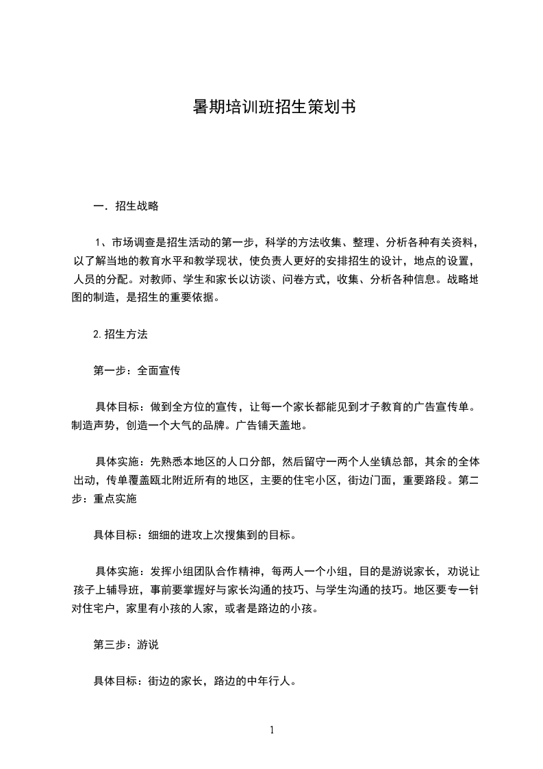 (2)招生方法 第一步:全方位轰炸 具体目标:做到全方位的宣扬,让每一个家长都能见到自己的广告宣扬单。制造声势,制造一个大气的品牌。广告遮天蔽日。 具体实施:先熟识本地区的人口分部,然后留守一两个人坐镇总部,其余的全体出动,传单、海报掩盖辅导班附近全部的地区,主要的住宅小区,街边门面,大型超市,重要路段。分区画片,分头分任务的工作。各尽其责。对各家各户进行摸底,看是不是下一步攻击的对象,做好记录。 其次步:重点攻击 具体目标:细细的攻击上次搜集到的目标。 具体实施:发挥小组团队合作精神,每两人一个小组,要达到双剑合璧天下无敌的地步,目的是游说家长,劝告让孩子上辅导班,事前要把握好与家长沟通的技巧、与同学沟通的技巧。地区要专一针对住宅户,家里有小孩的人家,或者是路边的小孩。 第三步:游说 具体目标:街边的家长,路边的中年行人。 具体实施:放置询问桌,放在重要的位置,两人一组,一人在路边散发传单,一人在询问台前,发传单的努力游说家长到询问台前坐下聊聊。发挥每个人的才能,尽可能的把有意愿的家长领到各个分部教学点。以便更好的达成目标。 招生过程从另一种意义上说:其实是一个人际交往的过程,要学会招生其实就是学会为人处世。 胜利者决不放弃,放弃者决不胜利。