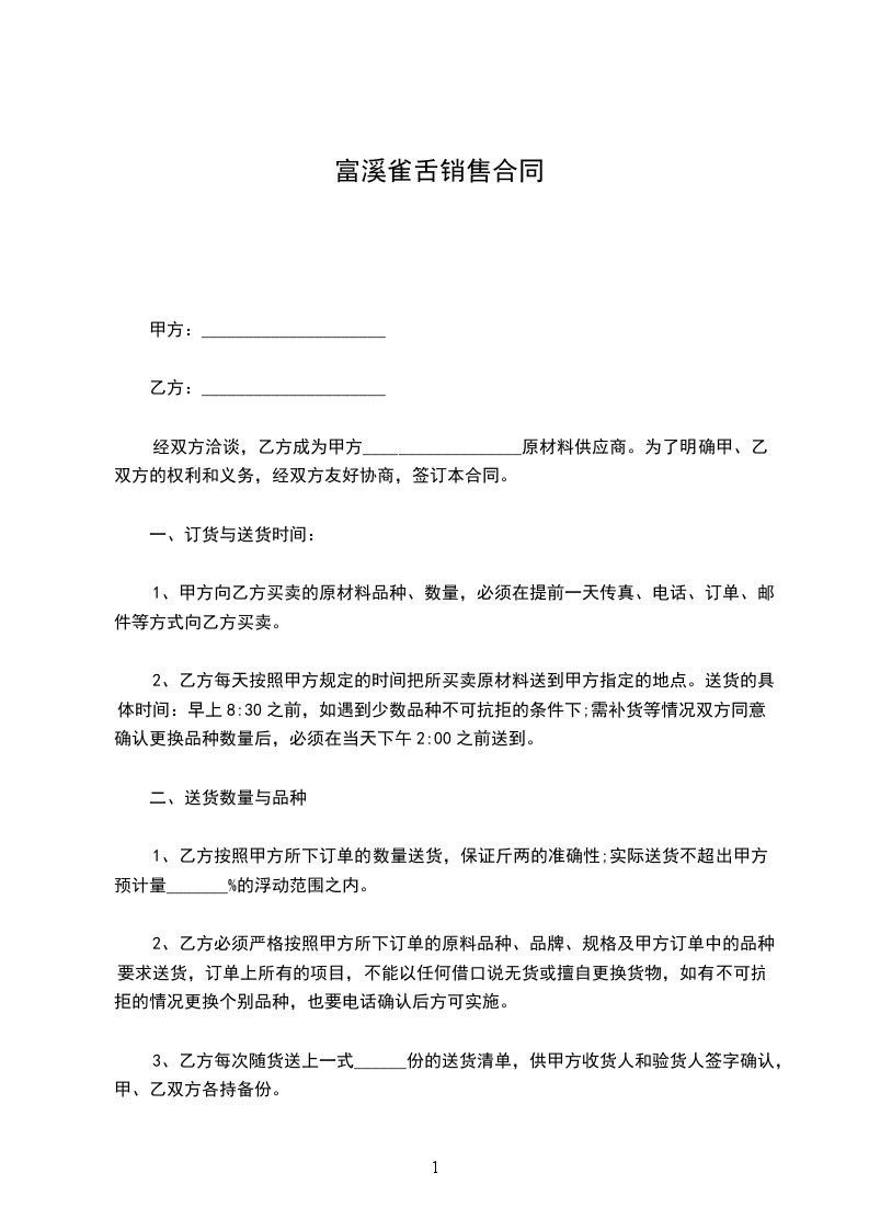 1、甲方向乙方买卖的原材料品种、数量,必须在提前一天传真、电话、订单、邮件等方式向乙方买卖。
