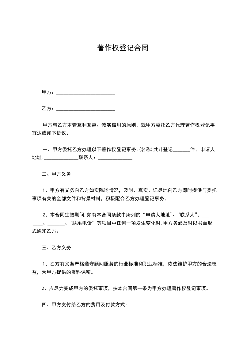 一、甲方委托乙方办理以下著作权登记事务:(名称)共计登记_______件。申请人地址:______________联系人:______________