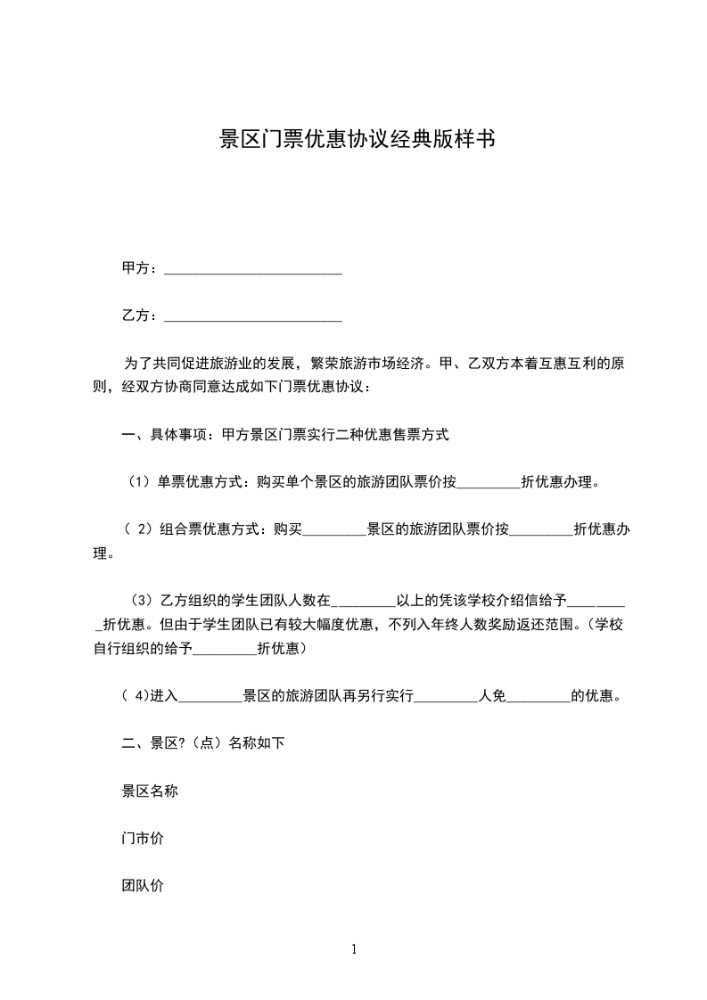 为了共同促进旅游业的发展,繁荣旅游市场经济。甲、乙双方本着互惠互利的原则,经双方协商同意达成如下门票优惠协议: